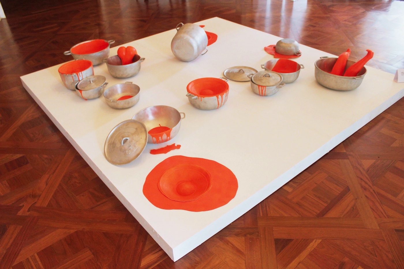Leasho Johnson, “In the Middle” (2017), Dutch pots, speakers, clay, variable dimensions. Photo by Randy Richards. Courtesy of the National Gallery of Jamaica