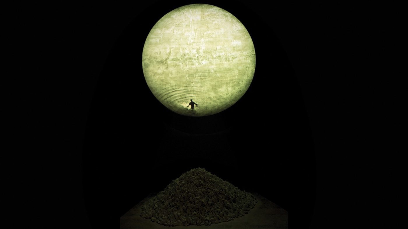 Simon Benjamin, “Urban Beaches: FORUM IV” (2016), white marl stone, gold paint on plastered plyboard, video projection. Courtesy of the National Gallery of Jamaica