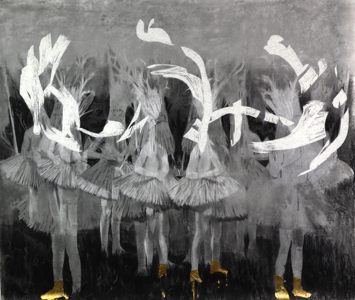 Cosmo Whyte, “Golden Kicks/Where You Get Dem Clarks (2016), charcoal and gold leaf on paper, 84 x 72 inches. Courtesy of the National Gallery of Jamaica