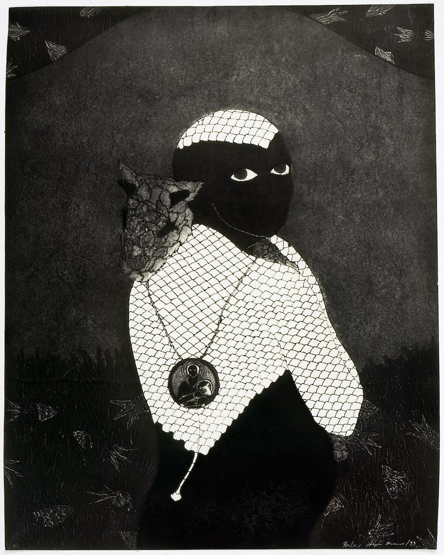 Belkis Ayón Manso was born in Cuba in 1967. She used the printing processes of collography and lithography to build a platform of ideas. She printed on paper and used cardboard and other hard surfaces as the foundation of her prints, erasing the stereotypical notions of softness in women’s art practice. These cardboard matrices are the basis of the prints and she would assemble them to create large scale haunting canvases, almost memorializing the subjects within.
