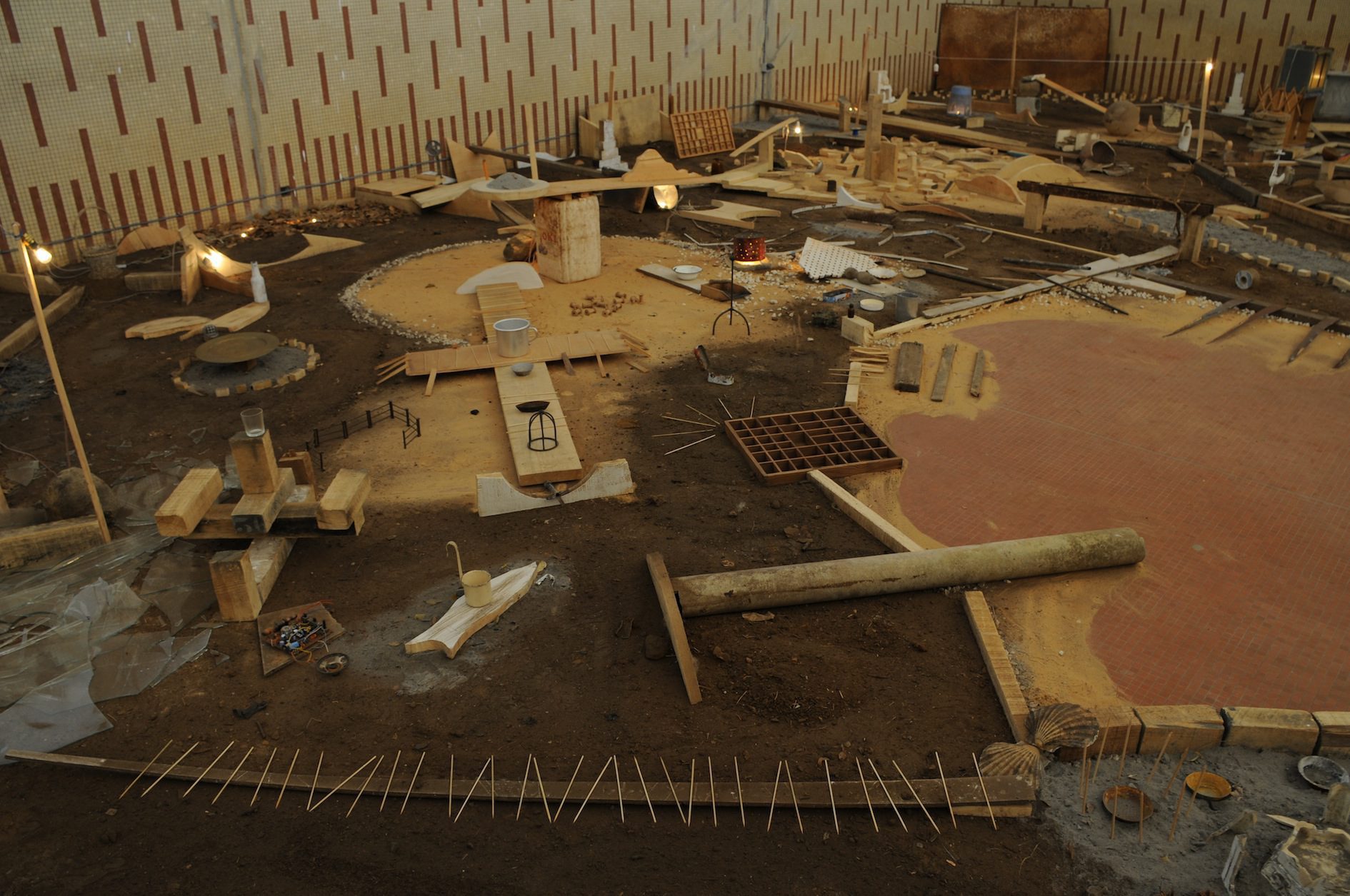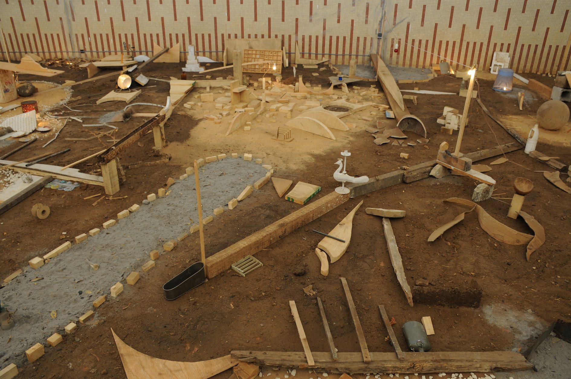 I had to make the work in three days, which meant that the objects used in the work were collected and chosen within the process of creating the work. The artistic process in this installation, as well as in my paintings, is based on the principle of collage and collecting. The objects collected signify the motion of living: each thing was once inhabited with our presence and are now traces of a fragmented life, bringing a poetic aspect to the work. Assembling this work was an endless search – conscious and unconscious – for relations and encounters between things. When I do a work of art there is always a geometrical aspect that comes out, like a calculation that underlines the relations between the elements of the work. Here, I wanted the viewer to step into the work in order to emphasize the tension between the different elements, as well as the huge scale of the installation. I installed a lamp in order to light the city at the end of day, to give it life. If you are here around seven when day is changing into night, you may feel this change from light to dark with these small lamps