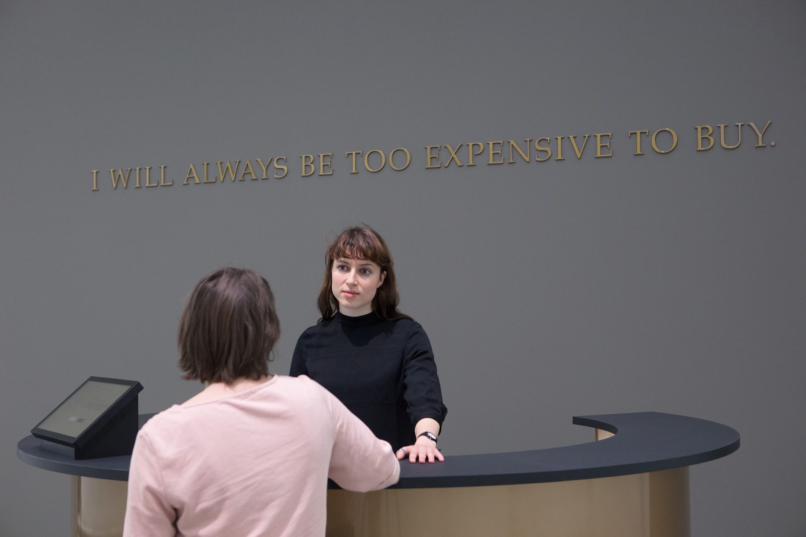 Adrian Piper, The Probable Trust Registry: The Rules of the Game #1-3, 2013-2017, Installation + Group Performance: 3 grey walls reaching from floor to the ceiling, 3 golden circular desks, golden embossed letters, 3 standing desks, 3 lean stools, computer system, 3 receptionists (one behind each desk). Adaptable Dimensions. Detail: The Rules of the Game #1. Staatliche Museen zu Berlin, Nationalgalerie / Thomas Bruns. Sammlung Staatliche Museen zu Berlin, Nationalgalerie. 2016 Schenkung der Freunde der Nationalgalerie. © Adrian Piper Research Archive Foundation Berlin. © APRA Foundation Berlin