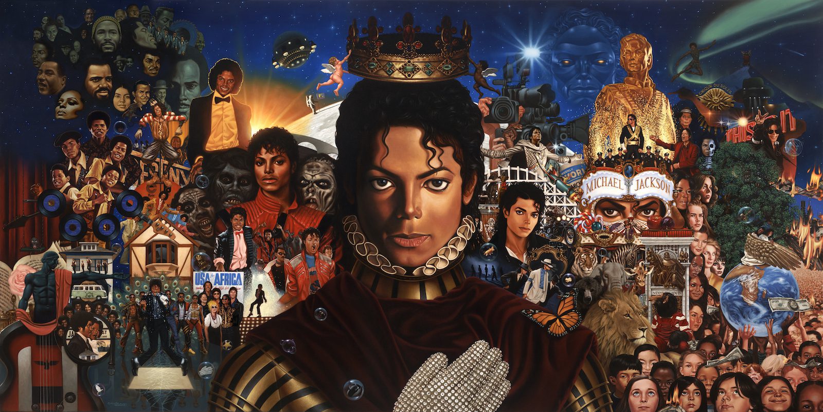 It isn’t the first time Nelson has created visually stunning work that captures a recording artist at multiple stages of his life. His most famous work to date, Michael, utilizes the exact same technique with the king of pop. Interlaced with religious symbolism and themes of royalty, it’s a triptych reminiscent of the kind of Medieval Dutch paintings that made Hieronymus Bosch famous. Michael captures the many dynamic stages of the artist’s life, from Jackson Five heartthrob to Thriller, Bad and Dangerous. By utilizing symmetry once again, Nelson creates a non-linear obituary to the artist’s life that casts a light on the many different reiterations of his profound career – and ultimately bestows upon him, as the two cherubs holding his crown convey, the king who conquered his duality, in life and death.