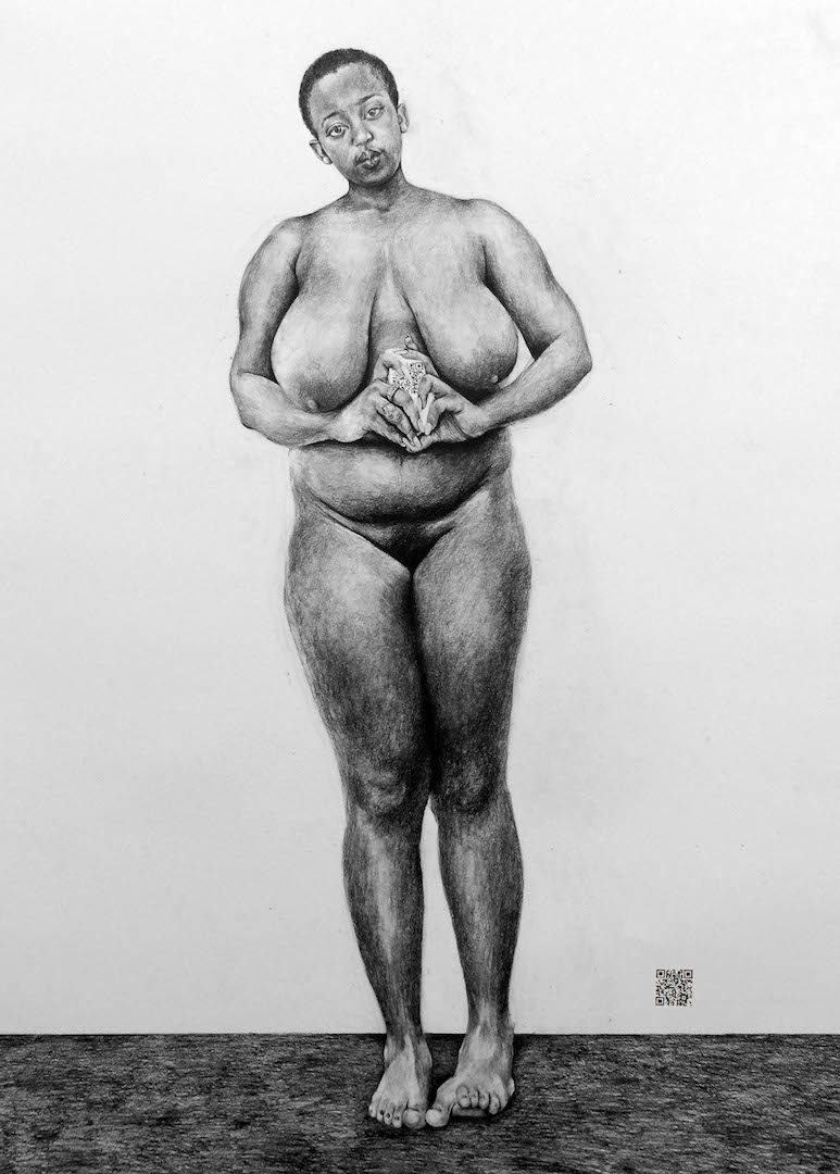 PB: I was mesmerised by this image I found, from Adrian Piper’s Food For The Spirit series, of the artist standing naked, holding her camera up to her chest, gazing out at the viewer, capturing her own image, insisting that this is how she demands to be seen. Food For The Spirit was a project exploring self-care and a decentring of the gaze onto the ‘other’, and it resonated strongly with me while I made Mutumia. I’m intrigued by how we negotiate our identities now, in the age of social media, where we connect and formulate our theoretical selves, practice our identity politics and devise versions of ourselves through which to speak. Asking each of my sitters to think about what it means to project both our theoretical, digital, curated self and our visceral, fleshy, flawed, beautiful, uniquely vulnerable sense was the real impetus of the work, which seeks to reimagine the female nude in art.