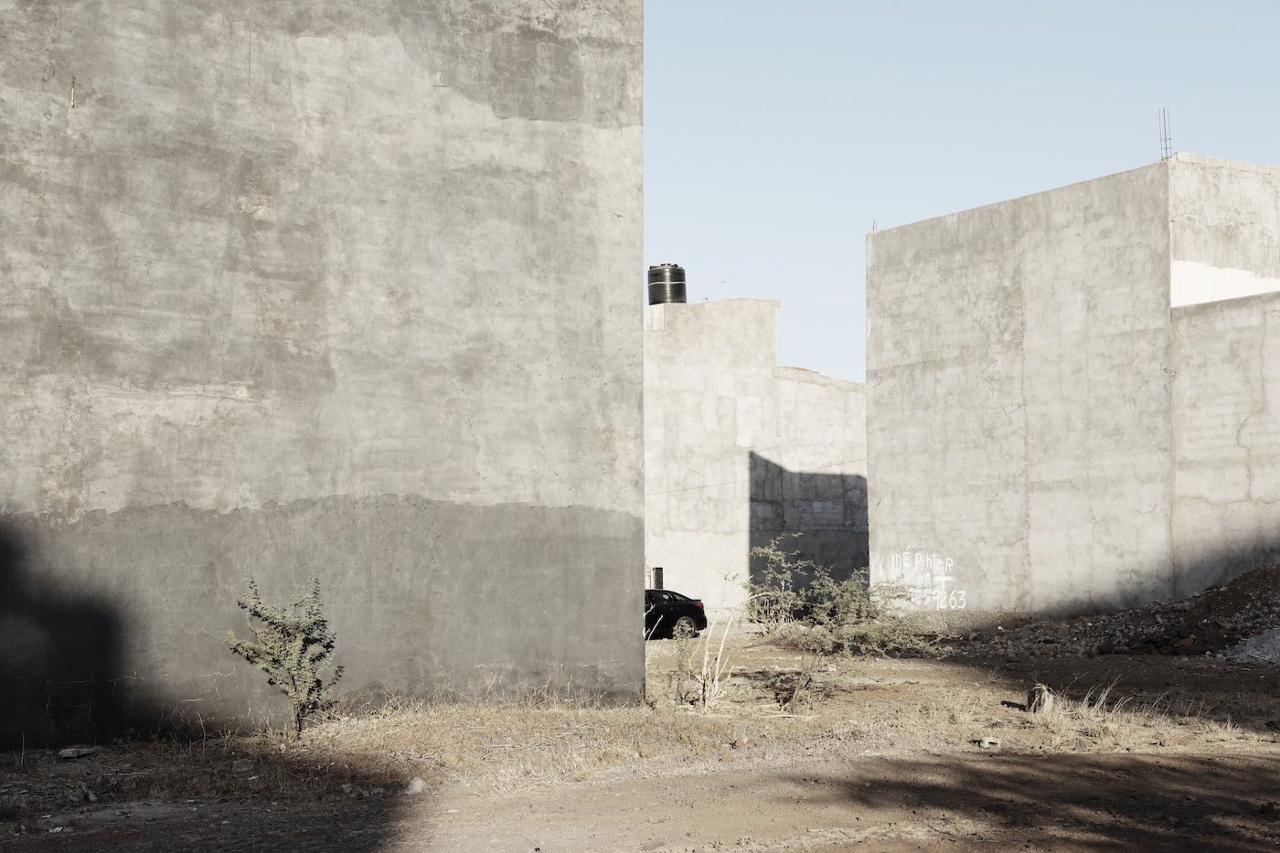 Dans Espaços Vacilantes, Schofield Cardoso présente des photographies austères et décontextualisées de bâtiments inachevés ou habités de manière précaire dans le Bairro da Cidadela, à Praia. Ces structures, initialement promues comme faisant partie d’une « ville du futur », représentent des métaphores d’une identité cap-verdienne fracturée par des modèles extérieurs. Les images rappellent l’esthétique de l’école New Topographics, un groupe de photographes paysagistes principalement américains réunis dans les années 1970 à New York, dans laquelle des espaces désolés construits par l’homme évoquent un sentiment d’étrangeté. Contrairement aux ruines abandonnées, les images de bâtiments habités de Schofield Cardoso provoquent un malaise en raison de leur apparence monolithique et de leur cadrage claustrophobique, reflétant la fragmentation sociale du Cap-Vert.