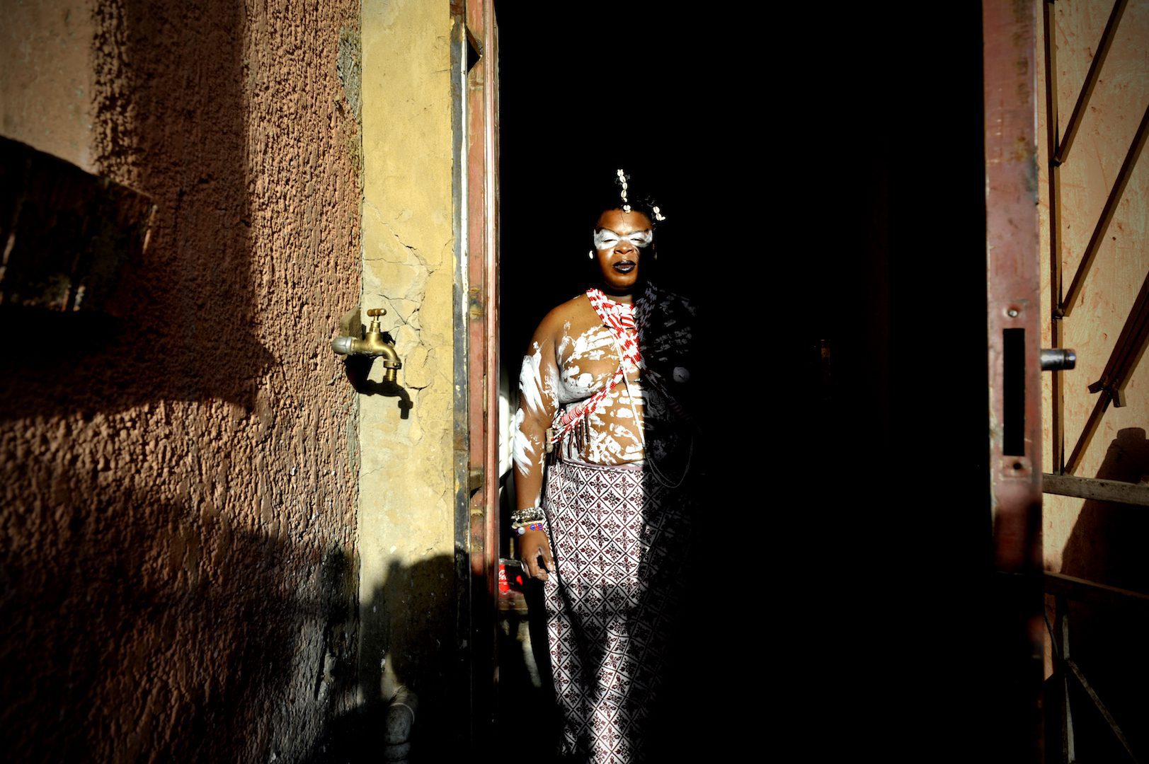 A sunny afternoon in Soweto’s southwest. Albert Ibokwe Khoza is facing me, standing very close, and he’s naked. Naked and obviously furious. He has only just burned a few dried leaves and waved them around in the improvised performance space. Now he’s staring at me and the other front row spectators with glinting eyes. He plants himself in front of us and stamps his big feet loudly. Albert is a traditional healer, a sangoma, so maybe it’s to do with a ritual, I think. But then he grabs his 1.50 metre long pigtail and whips it across the concrete floor. He’s just irritated, he says. When he was training to be a dancer people had already kept giving him those strange looks. Then he laughs and does a few Tendus.