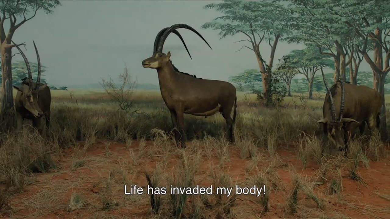 Kiluanji Kia Henda’s single-channel film Havemos de Voltar (We Shall Return) (2017), a wry post-colonial crime caper and droll meditation on the animal displays in the “endless corridors” of Luanda’s natural history museum. The work appeared on his solo exhibition In the Days of a Dark Safari at Goodman Gallery, Cape Town.