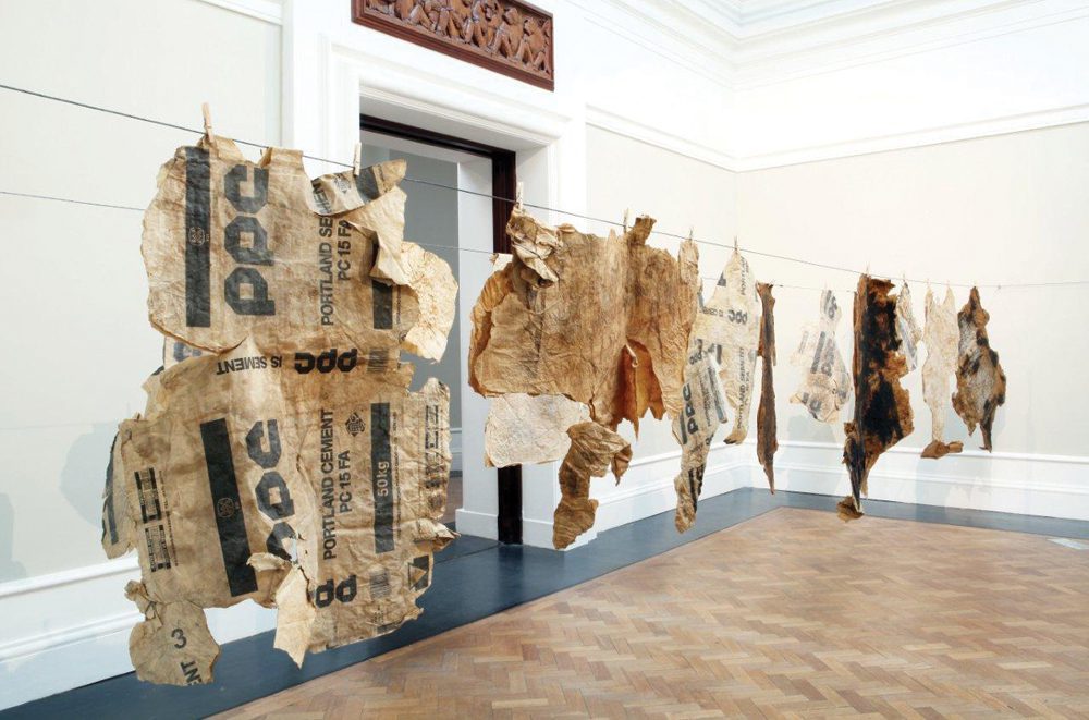 The National Gallery’s permanent collection includes Langa’s Untitled (1995), a hybridized drawing/installation composed of treated cement bags that anticipates his Drag Paintings. Here’s a thought. Every work of art is a speculative technology, an invention with the potential of becoming something else, something important, possibly a navigational system that will lead the artist and her/his viewers into the future. Langa’s Untitled (1995) is a good example. The story of post-apartheid art can be told through this important work, which heralded a new materialism in South African art. Maybe it is unfair to expect every artwork to be a diagnostic and enigmatic technology, but in an overcrowded marketplace for African art it is only fair to cultivate an acute filter.