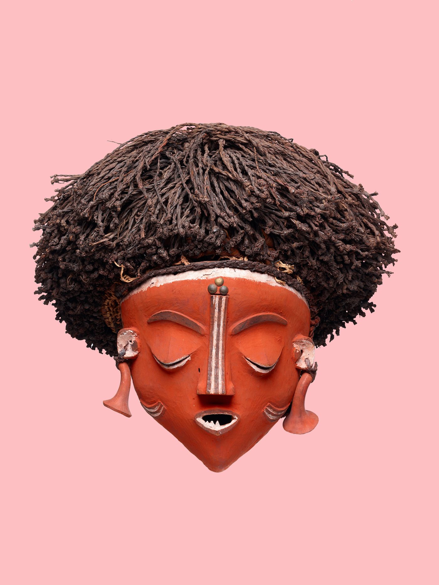 Mask with female face kambanda. Artists from the Pende region, Congo, before 1939. Wood, plant fiber, brass nails, 32 x 35 x 30 cm © Museum Rietberg Zurich, gift Barbara and Eberhard Fischer.
