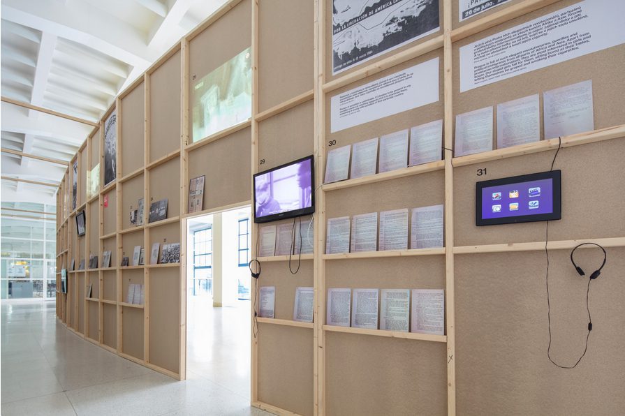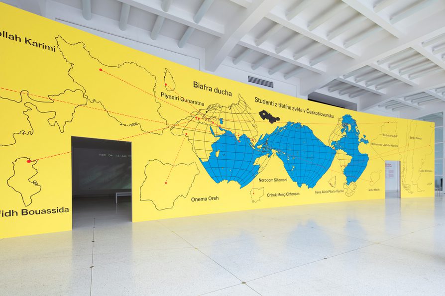 The show was presented in two screening rooms, each with multiple projections, and continued its display of films and archival material on a large tilted wooden arc. The front exhibited the unfamiliar view of an off-center world map with arrows tracing the movements of people, professional connections, and other lines of information, influence, and affection. A wealth of archival material was spread across the back of the wooden construction to form a tableau of the era using different media and artifacts. Organized around three interconnected chapters – the case of the University of 17th November, Czechoslovak Culture and the Decolonization Movement, and finally, Racism and Socialism – the show examined the legacy of a state-imposed solidarity and the foreign affairs support program of newly post-colonial and not yet aligned countries.