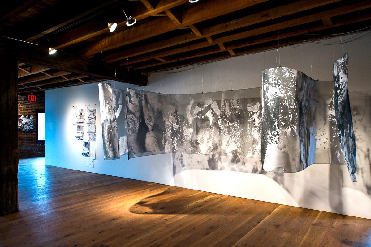Tahir Karmali, PAPER landscape, 2016, handmade paper made from immigration applications and photocopy toner, aluminum screening, and glass, dimensions variable. Courtesy of the artist.