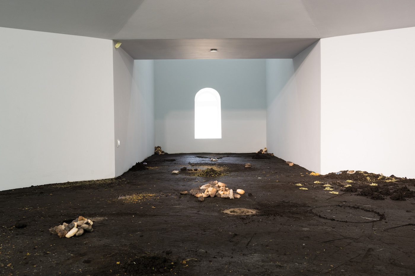 In sa __ ke lerole, (sa lerole ke __) (2016) and Mabu, Mubu, Mmu (Venice, 2017), she fills an empty room with compacted soil, into which she fashions various shallow, round, womb-like holes, sometimes lined with gold leaf, around which are dotted rocks, shells, feathers, healing herbs, and clay forms produced by a clenched fist. Bopape references her biography when she talks about these works, invoking the dry earth of Polokwane, north of Johannesburg, where she grew up, but also the more urgent politics of land and landlessness in her home country. In South Africa, as indeed everywhere else, land is a proxy for many conflicts around race and dispossession, and therefore a site of memory and identity. But it is clear that for Bopape the land or earth is an extension of the gendered self, as if the self is the land, as if the land – like a language – “speaks” the self.