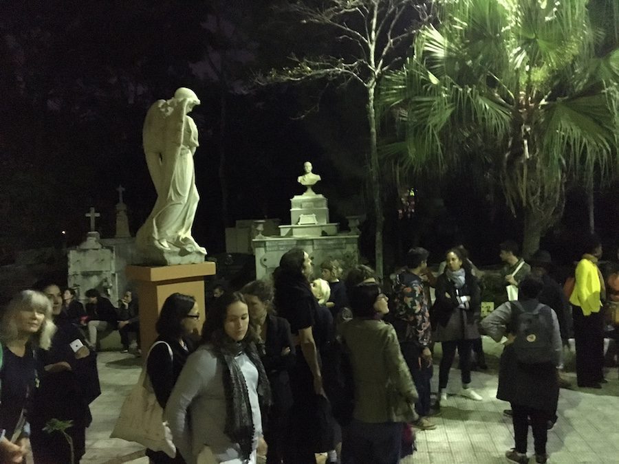 During opening days of the international exhibition, she presents three chapters of the book in performances at three cultural sites: Consolação Cemetery, the Afro-Brazil Museum, and the Ciccillo Matarazzo pavilion where the biennial is held. Local history and current events inspire stories that unfold in video projections, storytelling, and public announcements. None of her layered narratives has an ending. All are unfinished, calling to mind the countless unresolved issues that cling to most of our personal and shared histories. Photos below represent her performance last night in Consolação Cemetery.