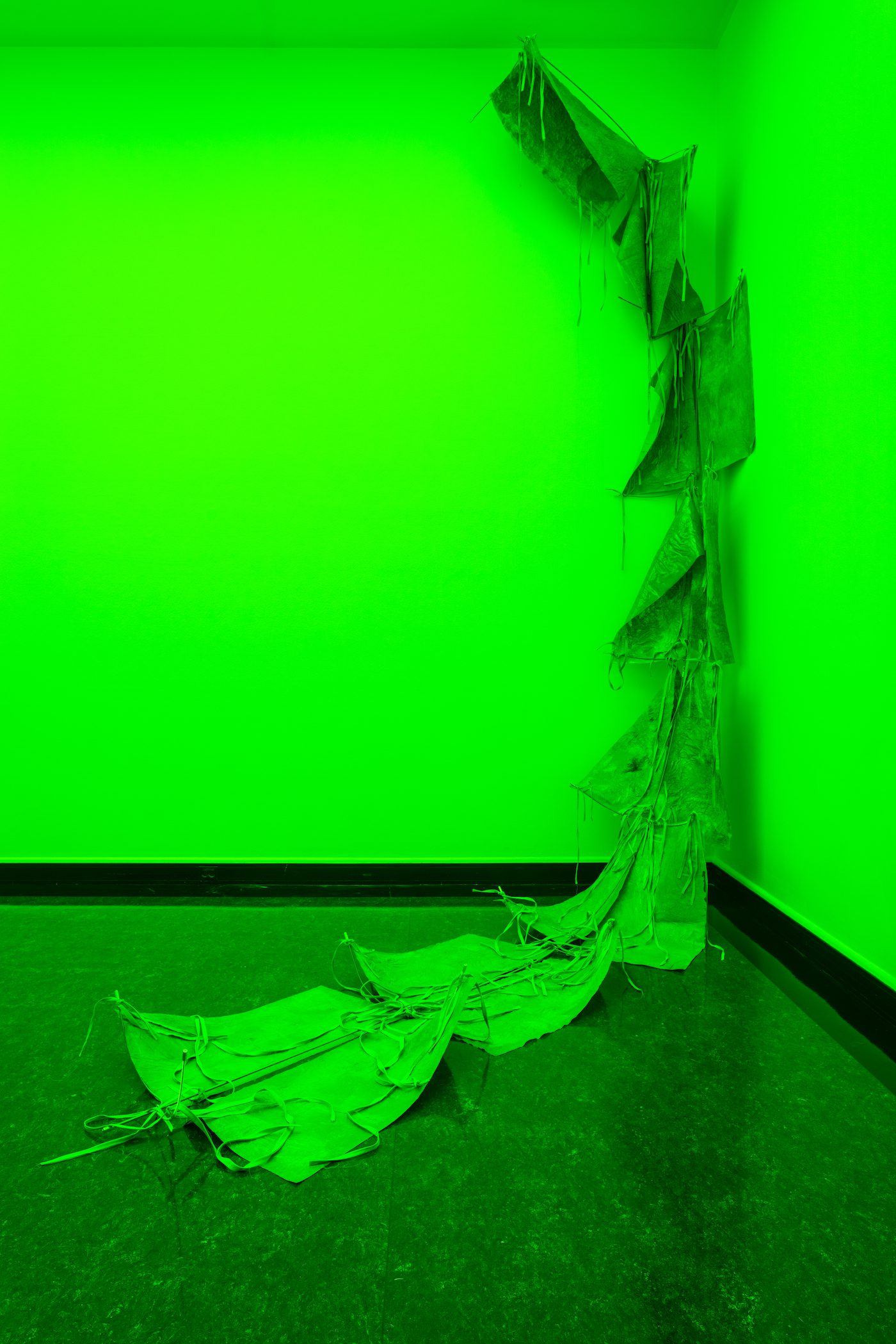 Sandra Mujinga, Coiling, 2019. Soft PVC, cotton, acrylic paint, glycerine, threaded rods and rod couplings. 800 x 100 cm.