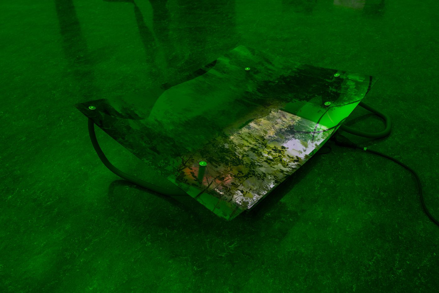 Sandra Mujinga, Stretched Delays 2, 2017. HD video (13 mins. loop), 32 inches LED TV, digital print on clear plexi glass (120 x 90 x 3 cm), steel and silicone rubber. Dancer: Nasheeka Nedsrea
