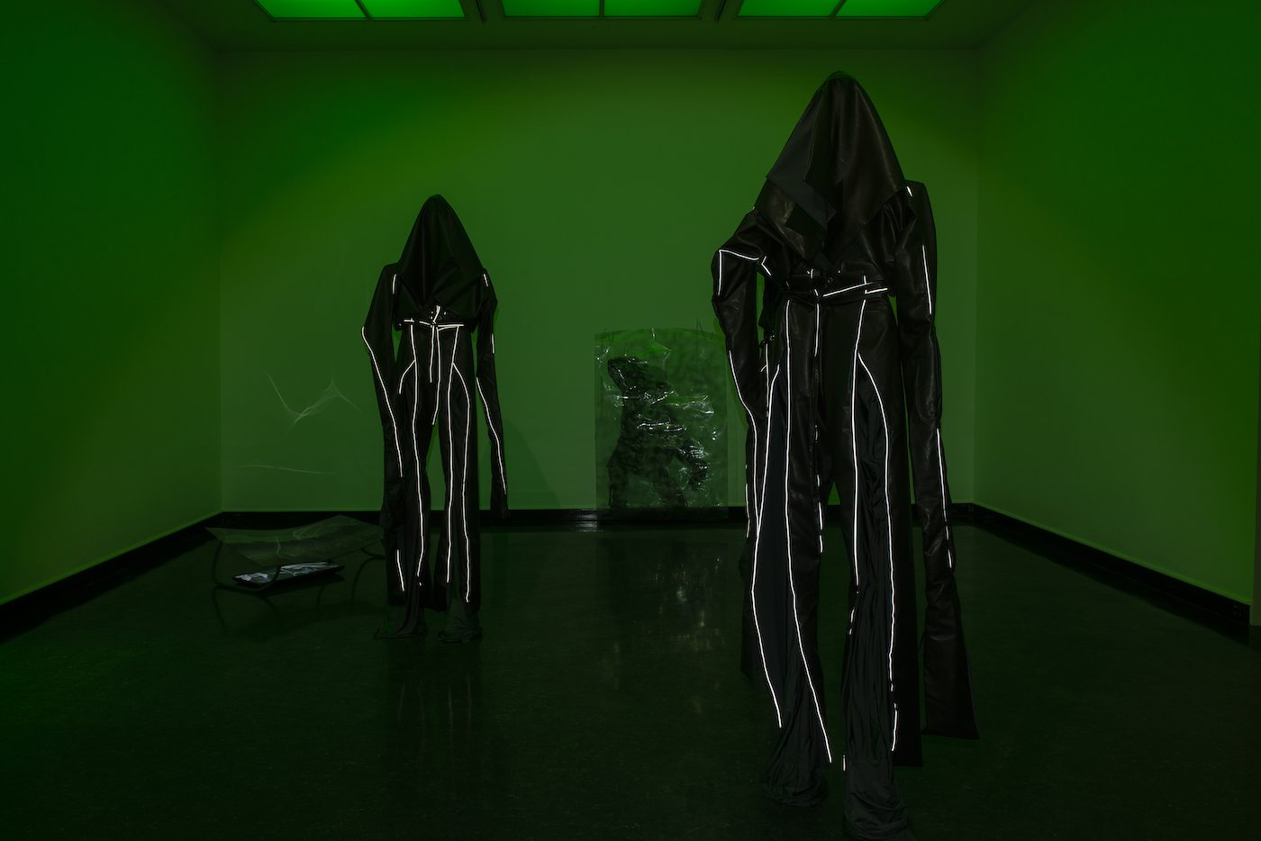 Sandra Mujinga, Nokturnal Kinship 1-3, 2018. Coated PU leather, gormets, polyester, lycra fabric, reflector fabric. Ca: 270 x 80 x 50 cm each.