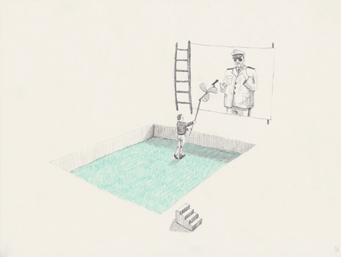 MS : En réalité, nombre de mes œuvres sont dérivées d’images photographiques fragmentées trouvées dans la presse. Je les découpe, les juxtapose, dessine par-dessus et les reproduis dans mon carnet de dessins et dans mes dessins préparatoires. On trouve des éléments ou des figures récurrents dans mes dessins, comme les uniformes militaires, par exemple ou, plus récemment, les cactus, parce que c’est plaisant à dessiner des cactus, et que cela me suffit pour les intégrer à un dessin. Je dessine des situations énigmatiques et ambiguës mariant le tragique et le burlesque. Ma pratique artistique consiste en ce que j’appelle des « formes dessinées », des articulations esthétiques et graphiques qui représentent l’indicible et, souvent, l’impossible. L’architecture de la composition comme forme de narration est aussi un élément essentiel de mon travail. Toutefois je demande un effort au regardeur, et ne livre pas tout.