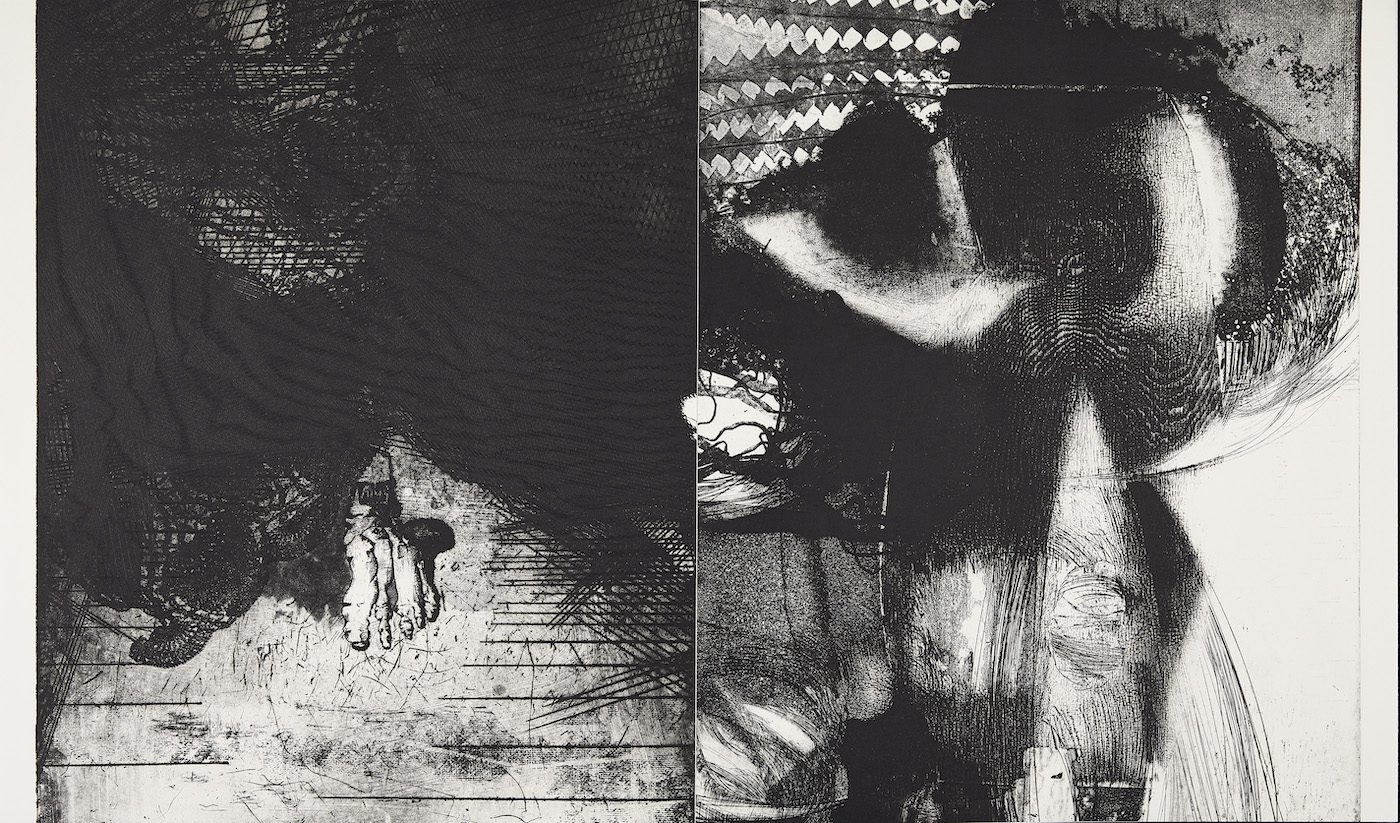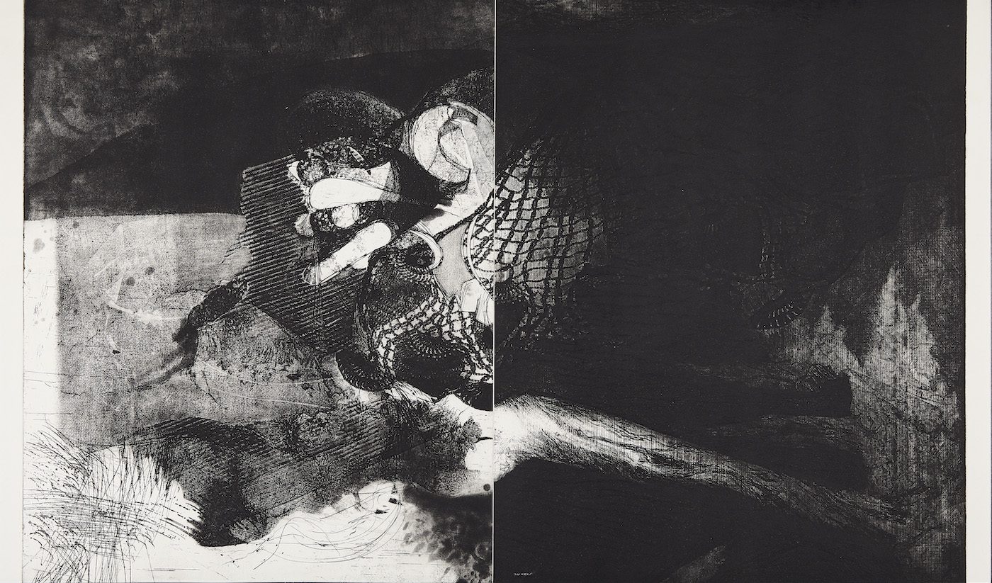 Tombstone Blues (1986) Mohammad Omar Khalil. Photograph by Andy Stagg, courtesy The Mosaic Rooms. Etching / softground / aquatint / spitbite, 91 x 121 cm