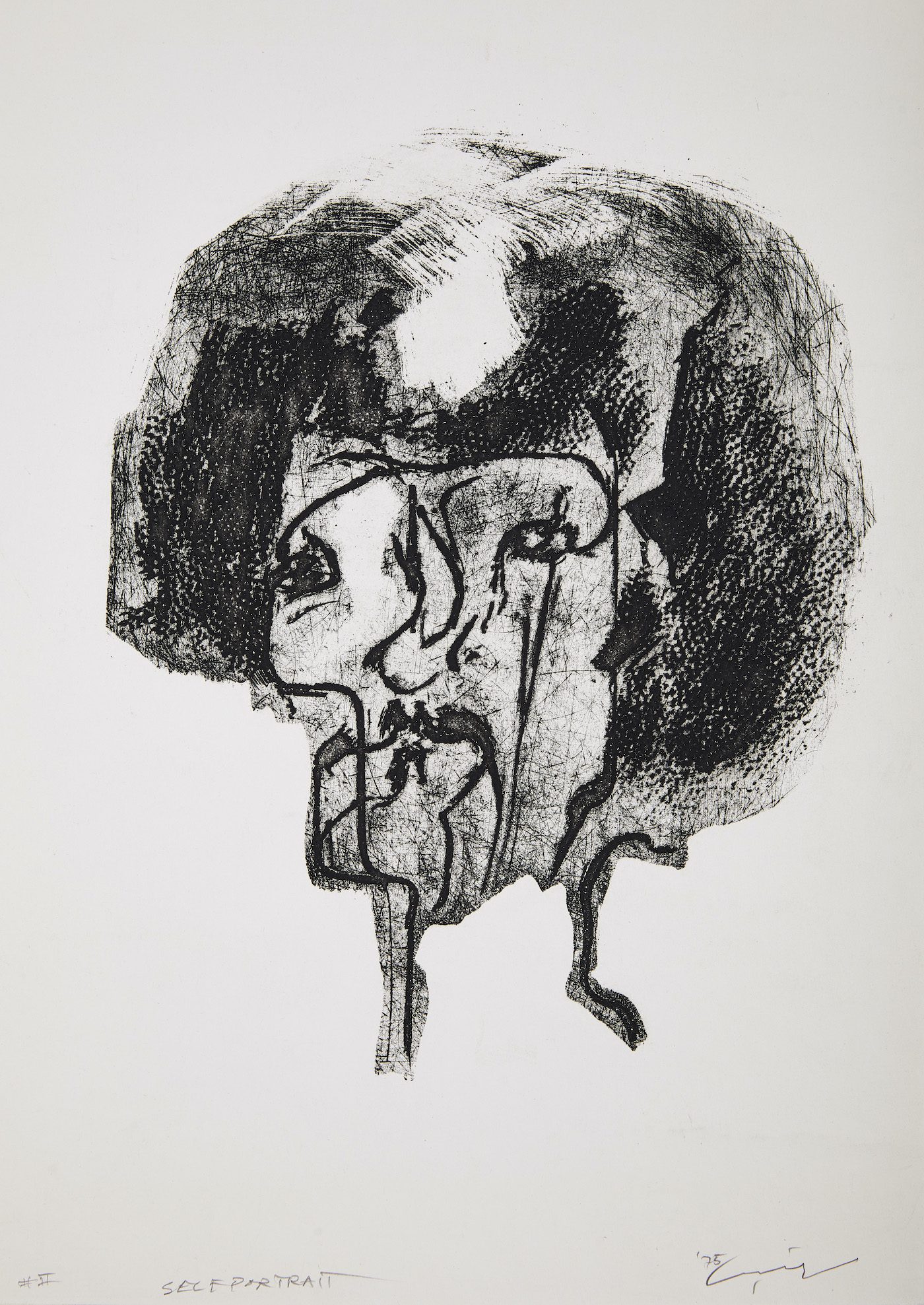 Mohammad Omar Khalil (b. 1936) is a painter, master printmaker and mentor. Practicing since the 1960s, he is one of the most significant artists of his generation from Sudan and the Arab world. The exhibition Homeland Under My Nails opens with a series of self-portraits and early works. Khalil, now 83, has long experimented with self-portraits as a means of self-transformation. One of his earliest self-portraits from 1968, at only 2cm by 2cm, challenges the form and medium. Much of the artist’s early work was destroyed in the flood that hit Sudan’s capital in 1988. The few works that survived are displayed here alongside early experimentations from the artist’s time studying at the Academy of Florence, showing the evolution of his style.