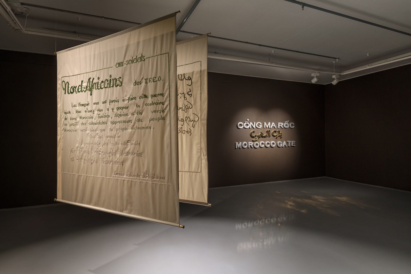 Dans The Specter of Ancestors Becoming (2019), qui retrace et met en scène le legs de la guerre de résistance antifrançaise (1946-1954) et les Africains de l’Ouest – un Sénégalais dans ce cas – contraints à se battre pour les colonisateurs français, nous sommes confrontés au stigmate du traumatisme et à sa transmission en tant que legs primaire et brut des anciens colonisés. Le communiqué curatorial de l’exposition se réfère à la « solidarité vietnamienne et sénégalaise », mais ni l’artiste ni le musée n’abordent les tensions autour de la Blackness au Vietnam – ce que Frantz Fanon appelle « négro-phobogénèse » dans Peau noire masques blancs (1952), la manière dont la Blackness, et peut-être l’anti-Blackness, constituent « un anxiogène », soit une sorte de phobie irrationnelle. À l’inverse, les contradictions inhérentes à la structure mondiale de l’anti-Blackness et de la solidarité, également au Vietnam, sont aplanies. Ceci aurait dû être une problématique essentielle de la scénographie de cette exposition dans cette région du continent africain, et sera de même essentielle pour sa réception par un public (sud-) africain.