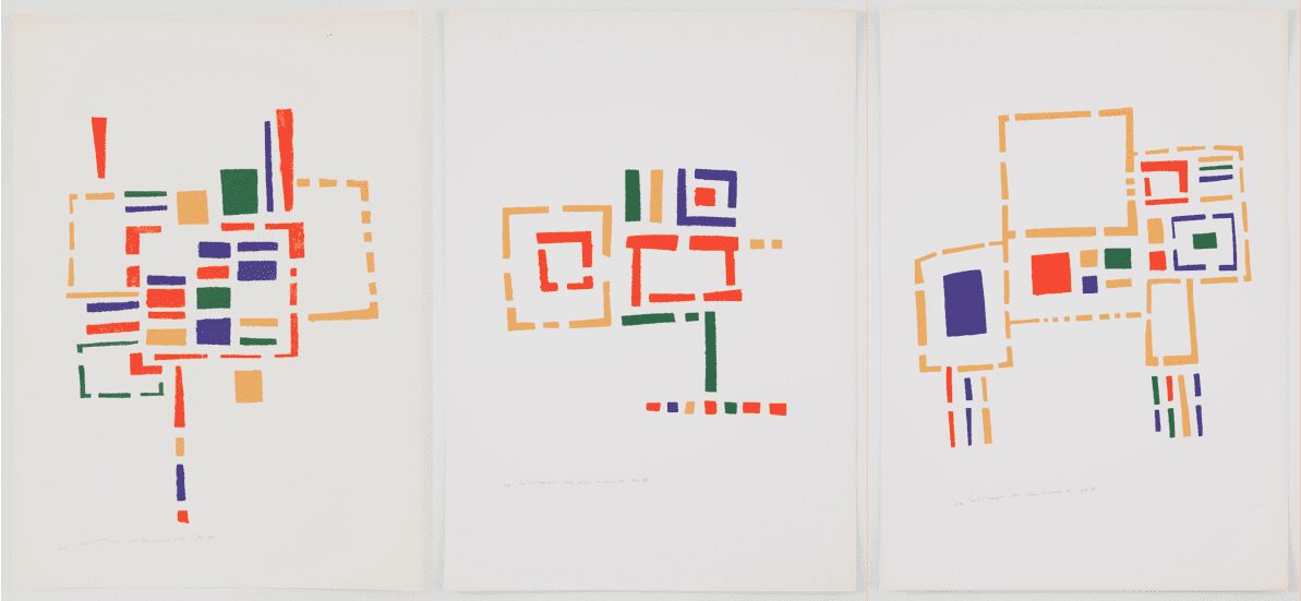 (left) Mildred Thompson, Untitled (No. VIII), 1973. Silkscreen print on paper, 61.3 x 42.9 cm. (middle) Mildred Thompson, Untitled (No. IV), 1973. Silkscreen print on paper, 61.3 x 43 cm. (right) Mildred Thompson, Untitled (No. III), 1973. Silkscreen print on paper, 61.1 x 42.9 cm. All Courtesy The Mildred Thompson Estate and Galerie Lelong & Co., New York