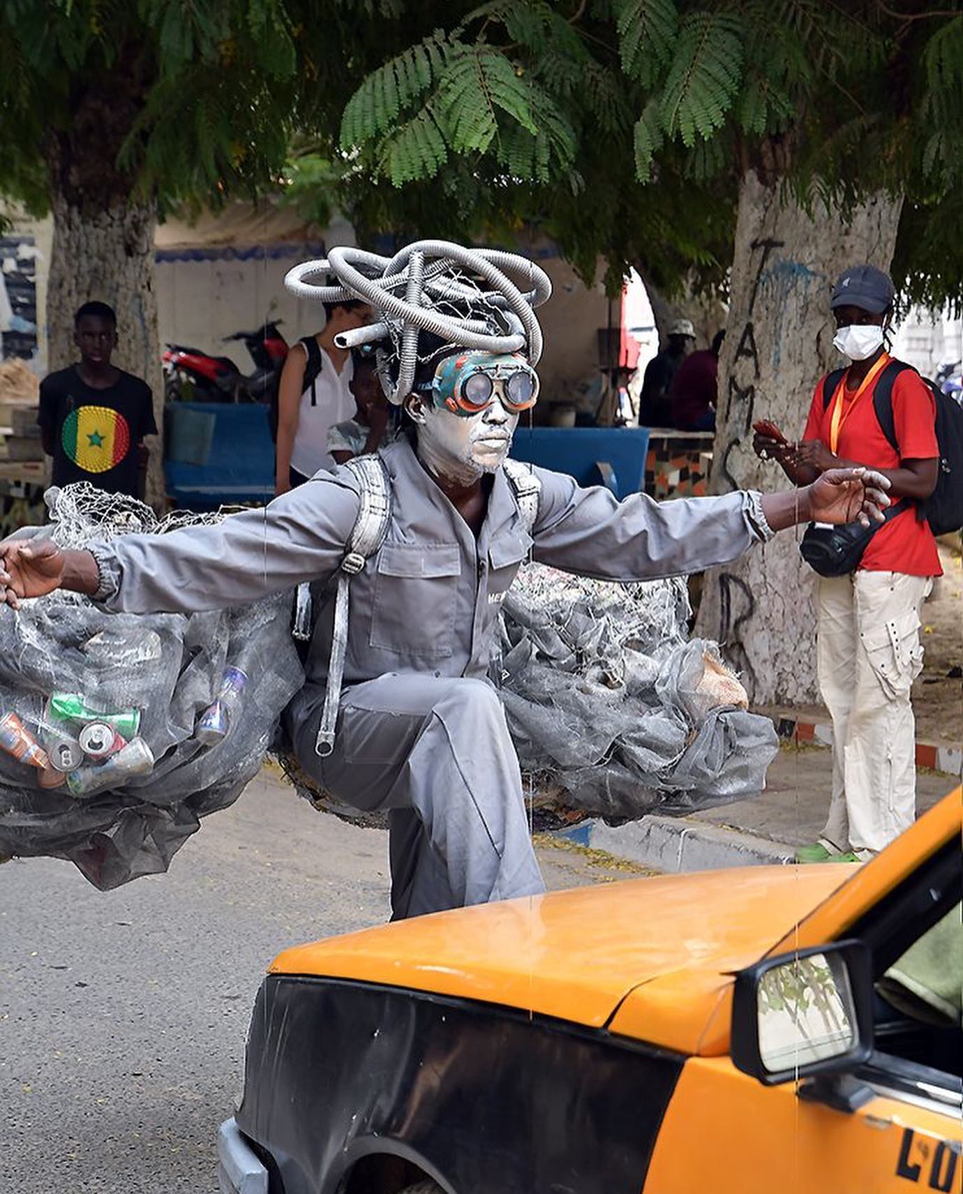 Le collectif Villes en Mouvement avec Ker Thiossane et Alt-Del Geej Mambulaan a organisé un programme d’art performatif sur le thème de l’écologie dans une conversation ouverte avec les rues. Une autre proposition performative est celle de Precy Numbi, artiste installé à Bruxelles, qui a commencé à développer des performances de robots éco-futuristes à Kinshasa. Precy Numbi et son alter ego, Robot Kimbalambala, ont invité quelques camarades de la diaspora de Kigali et d’Abidjan à partager un doxantu (« une balade » en wolof), déambulant à travers éco-futurisme, célébrations rituelles et rencontres humaines non-humaines entre l’océan Atlantique et d’immenses sites industriels, voués à devenir des appartements de luxe.