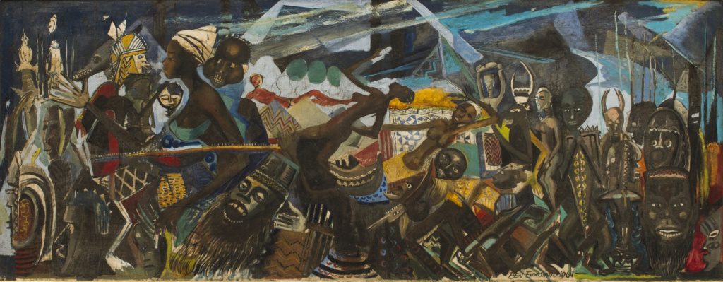 There is something interesting to note in chapter 7 (Nations seeking form). And that is “Birmingham” (1964) by Jack Whitten, a resounding critical work of police violence against black American protesters during the Civil Rights Movement period as well as “Tabaski-Sacrifice of the sheep” (1963), a series of canvases by Iba N’diaye or even Ben Enwonwu’s “Going” (1961). Once again we find elements that guide the exhibition, the inclusion of either Iba N’diaye or Ben Enwonwu in this chapter is not unexpected (despite the surprise they could cause when we think of what was hitherto established as postwar art), since the work of both is strongly linked to the construction of national-artistic identities of their newly independent countries. But putting them together, in dialogue, with the work of Jack Whitten, enables us to deal with Whitten’s work not only as part of a minority’s narrative of struggles within a nation, in this case the US, but in a transnational context.