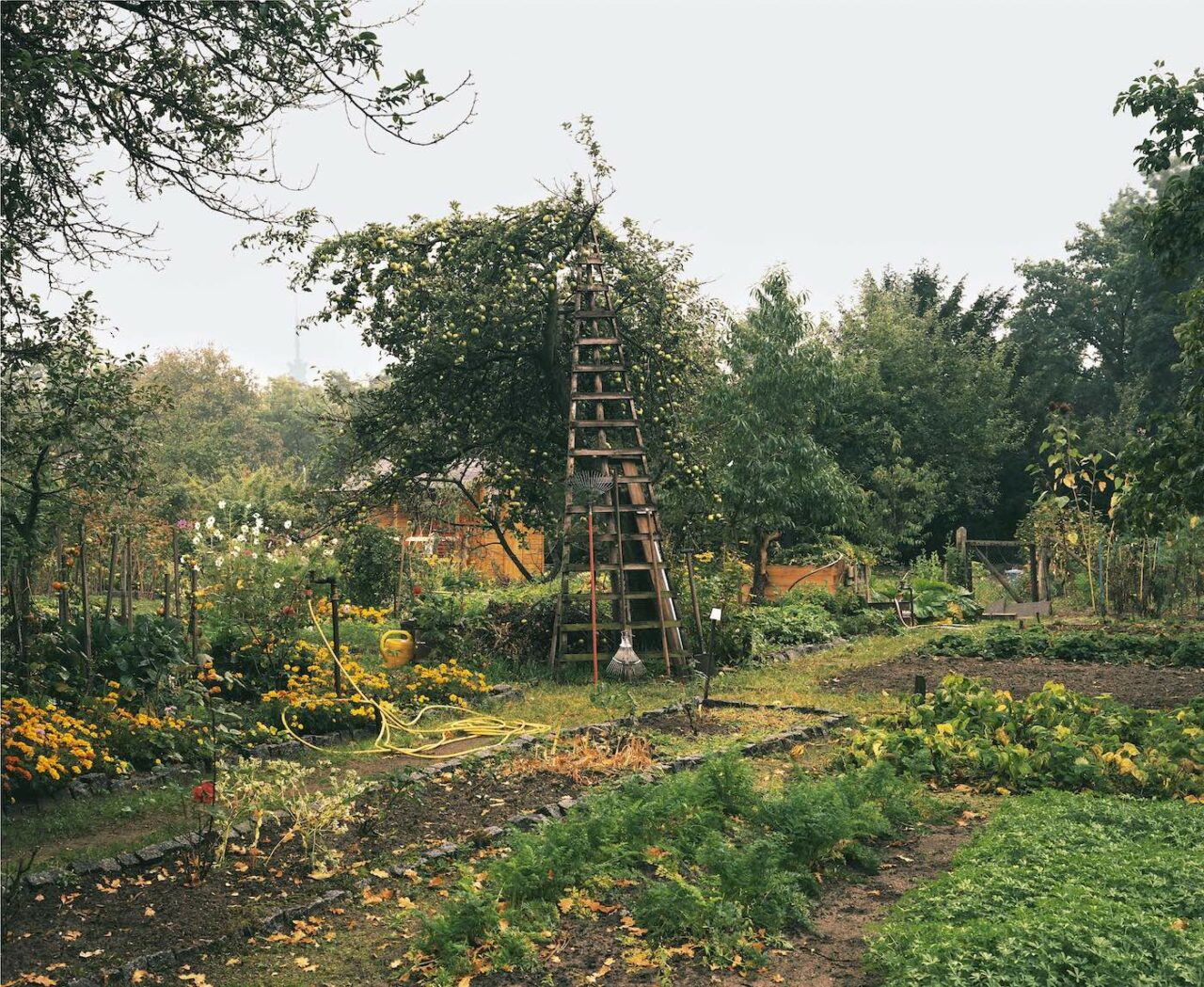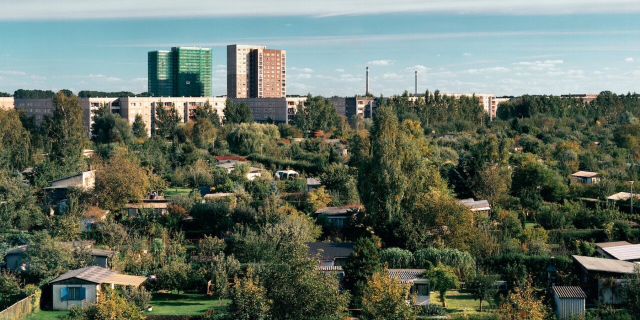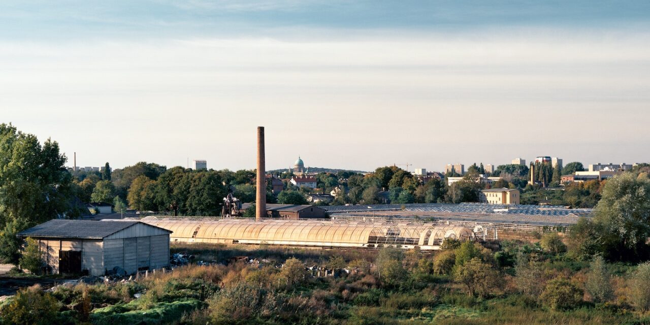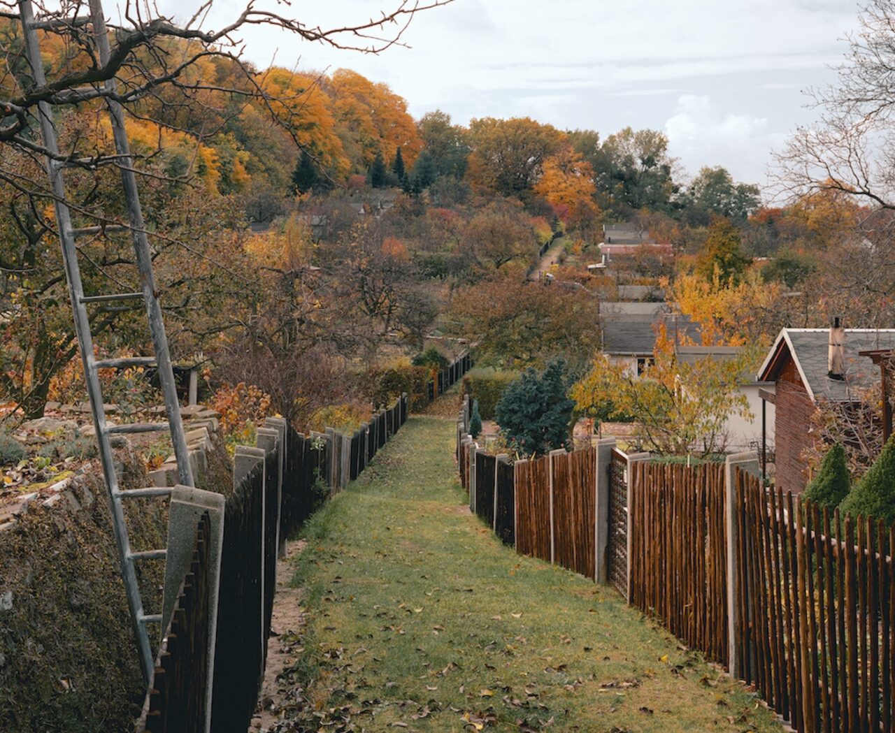 STAN DOUGLAS, VIEW OF “AN DER ALTEN ZAUCHE” WITH PLATTENBAUTEN, HOCHHÄUSERN AND THE TWIN SMOKESTACKS OF KOHLEHEIZWERK REHBRÜCKE, AM SCHLAATZ, 1994/95, FROM THE SERIES POTSDAMER SCHREBERGÄRTEN, 15 PARTS. HASSO PLATTNER COLLECTION, © STAN DOUGLAS, COURTESY THE ARTIST, VICTORIA MIRO AND DAVID ZWIRNER