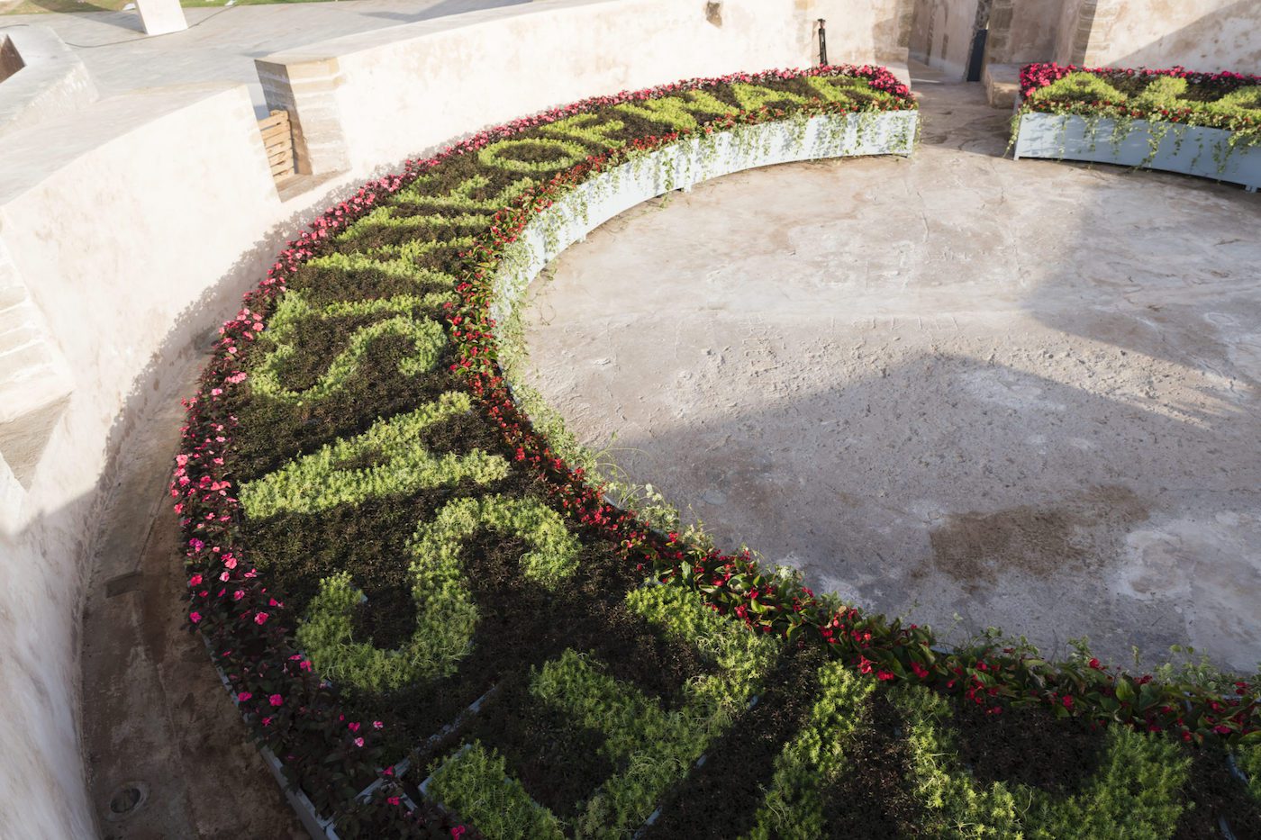 Ghada Amer, All oppresion creates a state of war, 2019. Installation view, Plantes, fer forgé, bois. Dimensions variables. Courtesy Marianne Boesky Gallery.