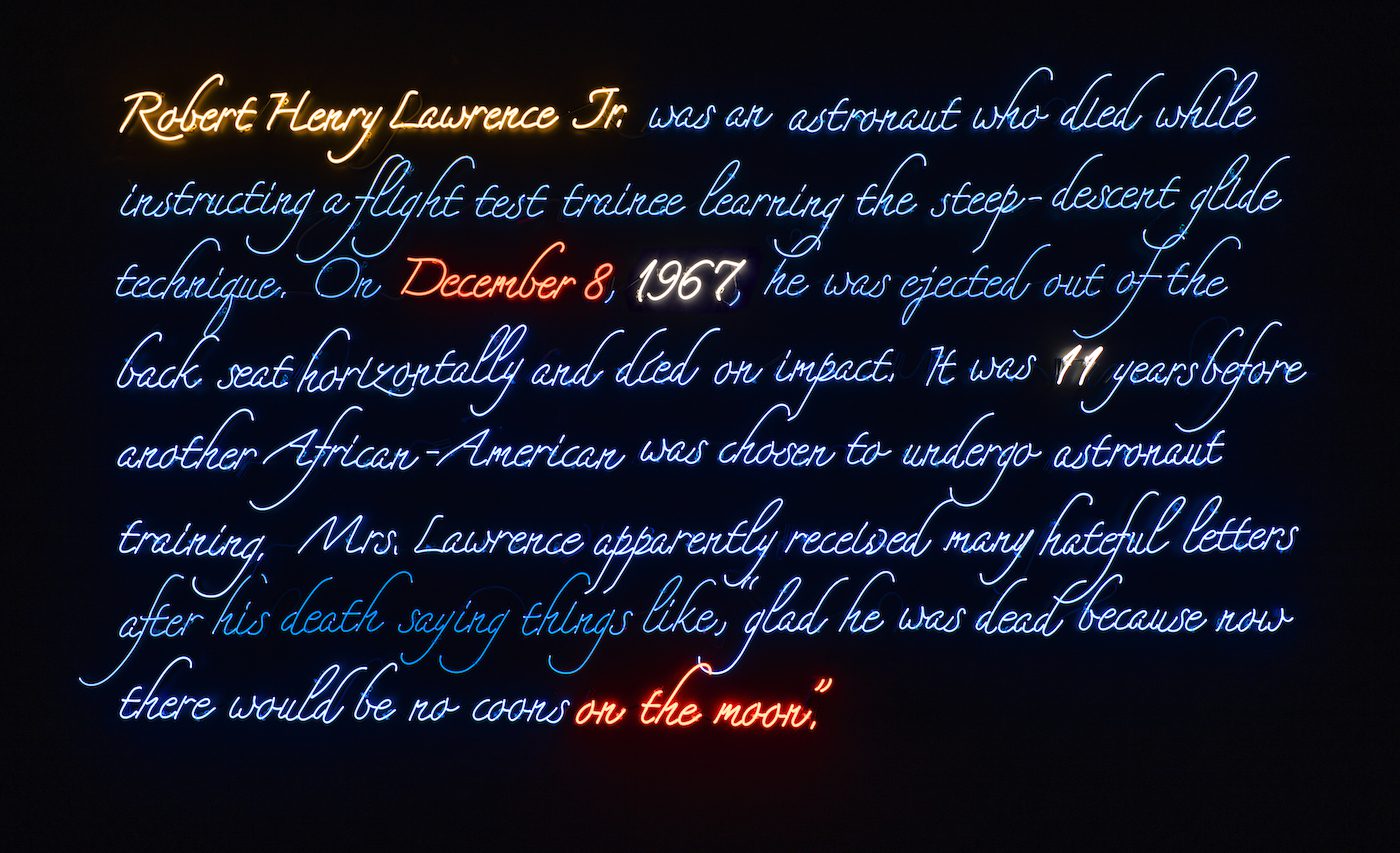 Tavares Strachan, « Robert Henry Lawrence Jr. », 2018. 4500k neon, blue neon, yellow neon, orange neon, tube supports, transformers. Photo: Brian Forrest, Courtesy Regen Projects, Los Angeles