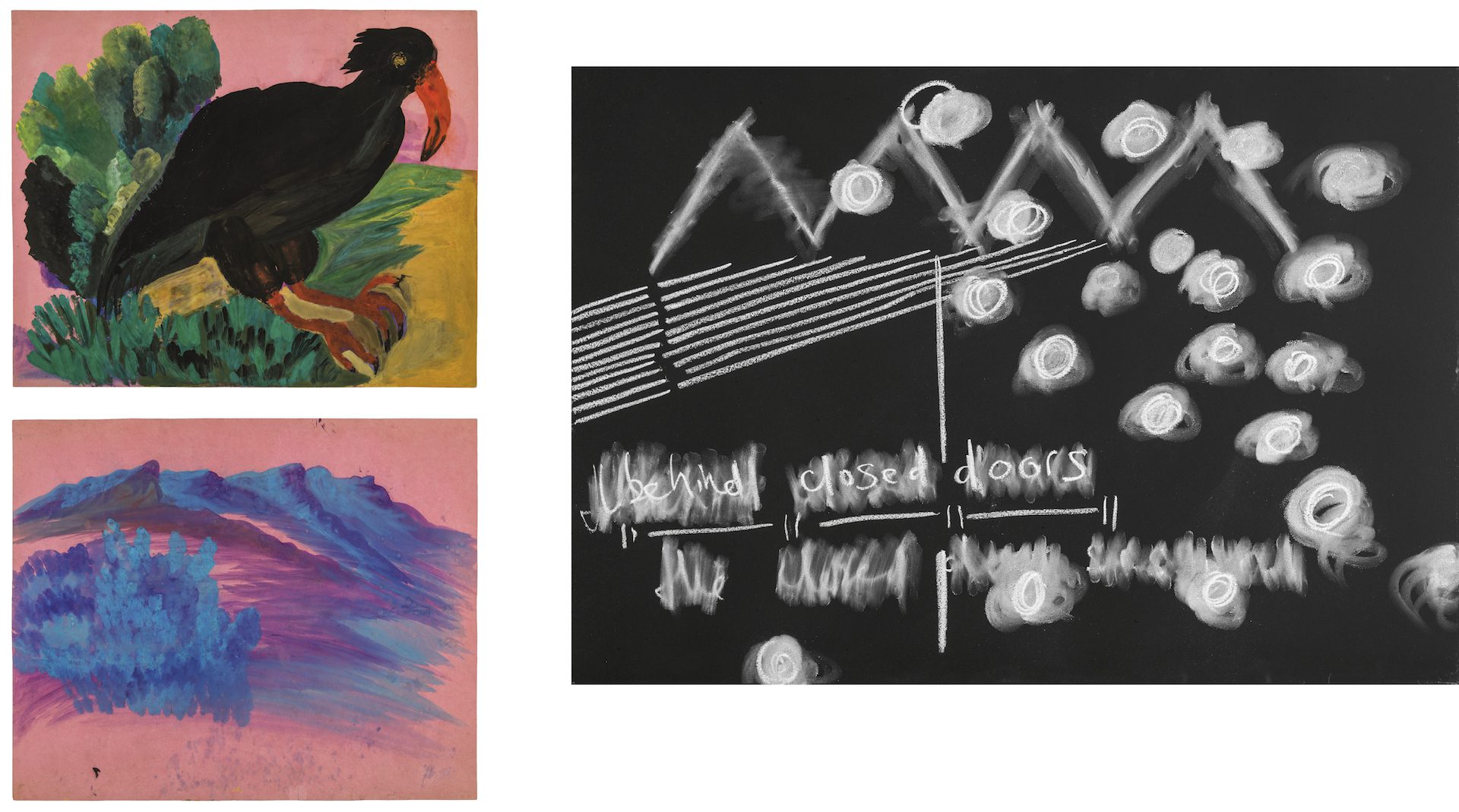gouache on paper, right: Drawing in collaboration with Sophia Lehulere, 2015, chalk on blackboard. © Kemang Wa Lehulere, Sophia Lehulere, Gladys Mgudlandlu, courtesy STEVENSON Cape Town and Johannesburg