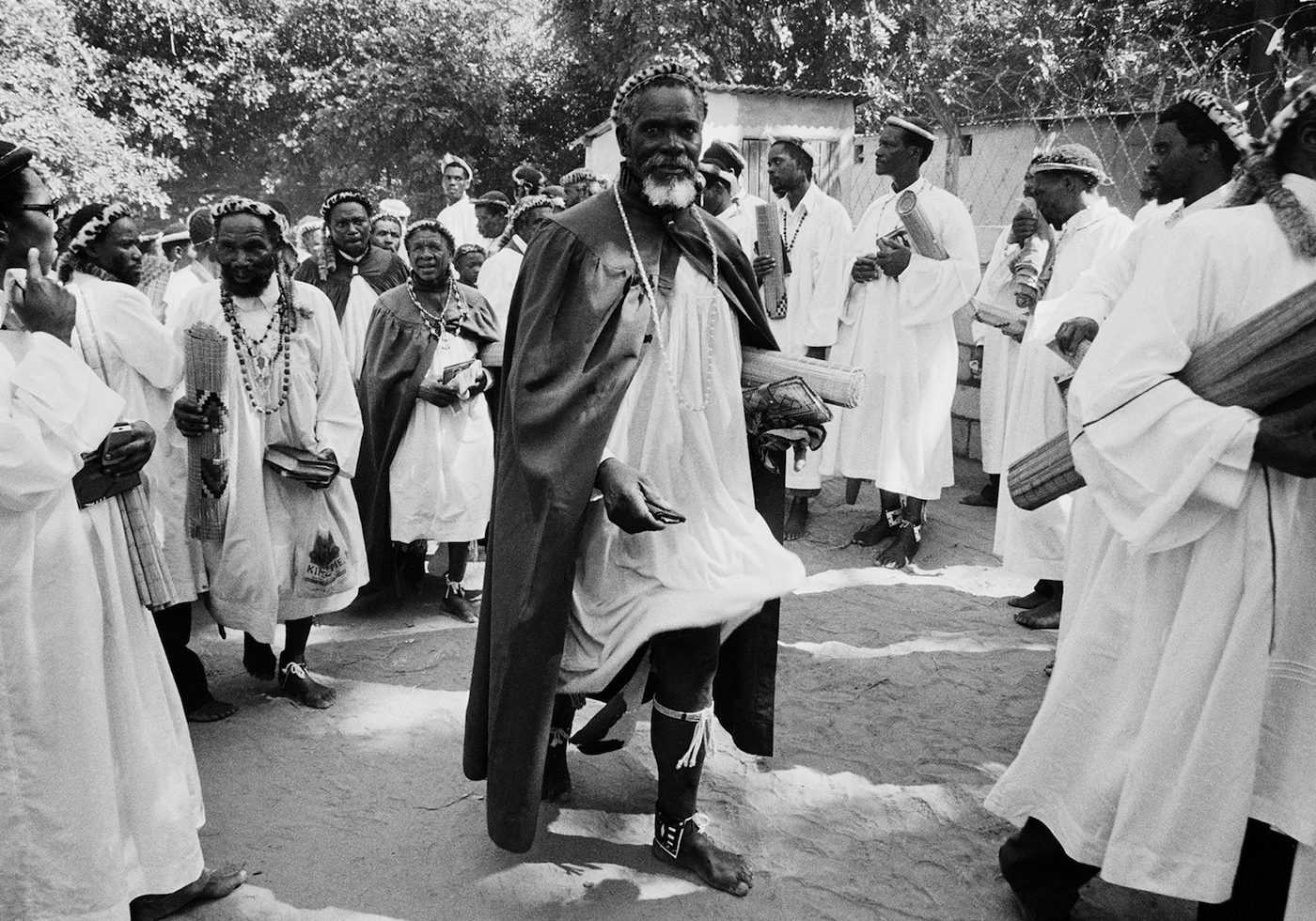 Stylistically, and by this I mean in terms of both aesthetic veneer and disciplinary strictures, Tshabangu can be said to have evolved within the social documentary genre. Early on, as testified by the section “City in Transition,” his camera was trained on black folks’ mobility—by taxi, train, or on foot—in and out of the city. Confident, he moved on to focus on a people dealing with the meaning of freedom via their age-old mysticism and African spiritual practices, before breaking out into the hostel dwellers’ digs and rural environs. By all intents, even in the post-1994 work displayed in Footprints, Tshabangu is a man of the 1980s, and in character and language, he appears stuck in there. There’s nothing extravagantly contemporary, hip, arty, current, or fashionable about his photographs, and yet his work is revolutionarily refreshing for its timelessness. It shouldn’t work wonders, but it does. There’s a backstory to this.
