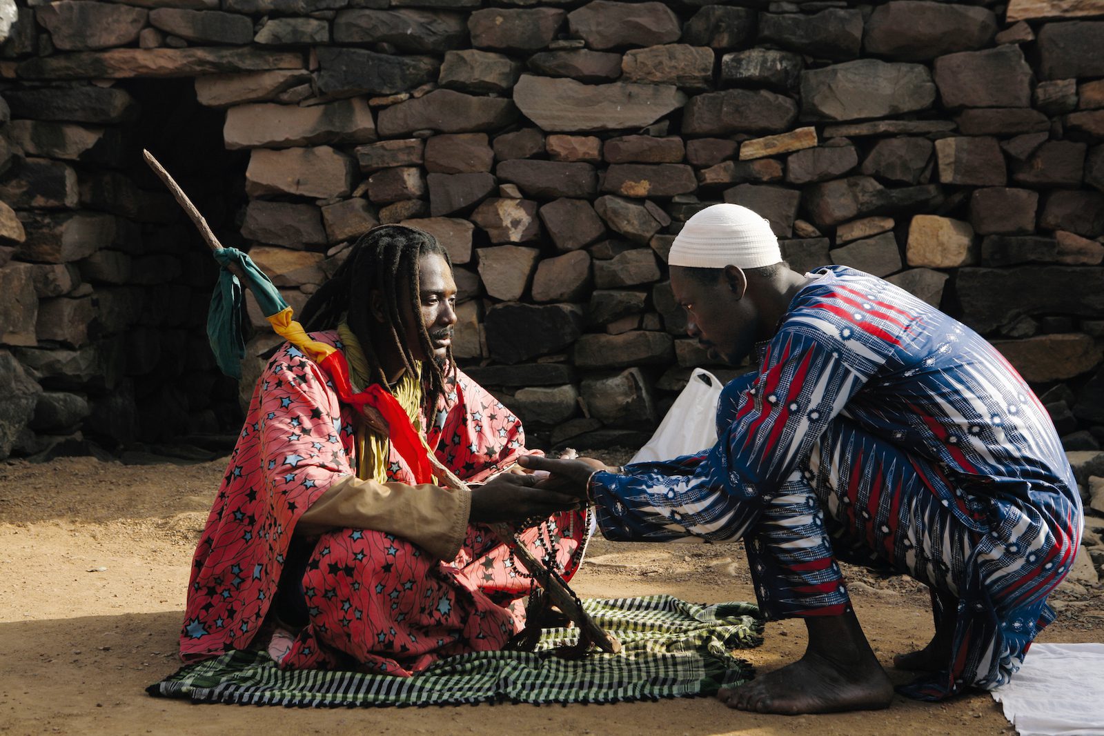 Seydou Camara, One of the sons of the late El Hadji Soufi Adama Yalcouye receives a worshiper in their mosque, which was built in the midst of the Niger’s riverbed, 2016. Courtesy the artist