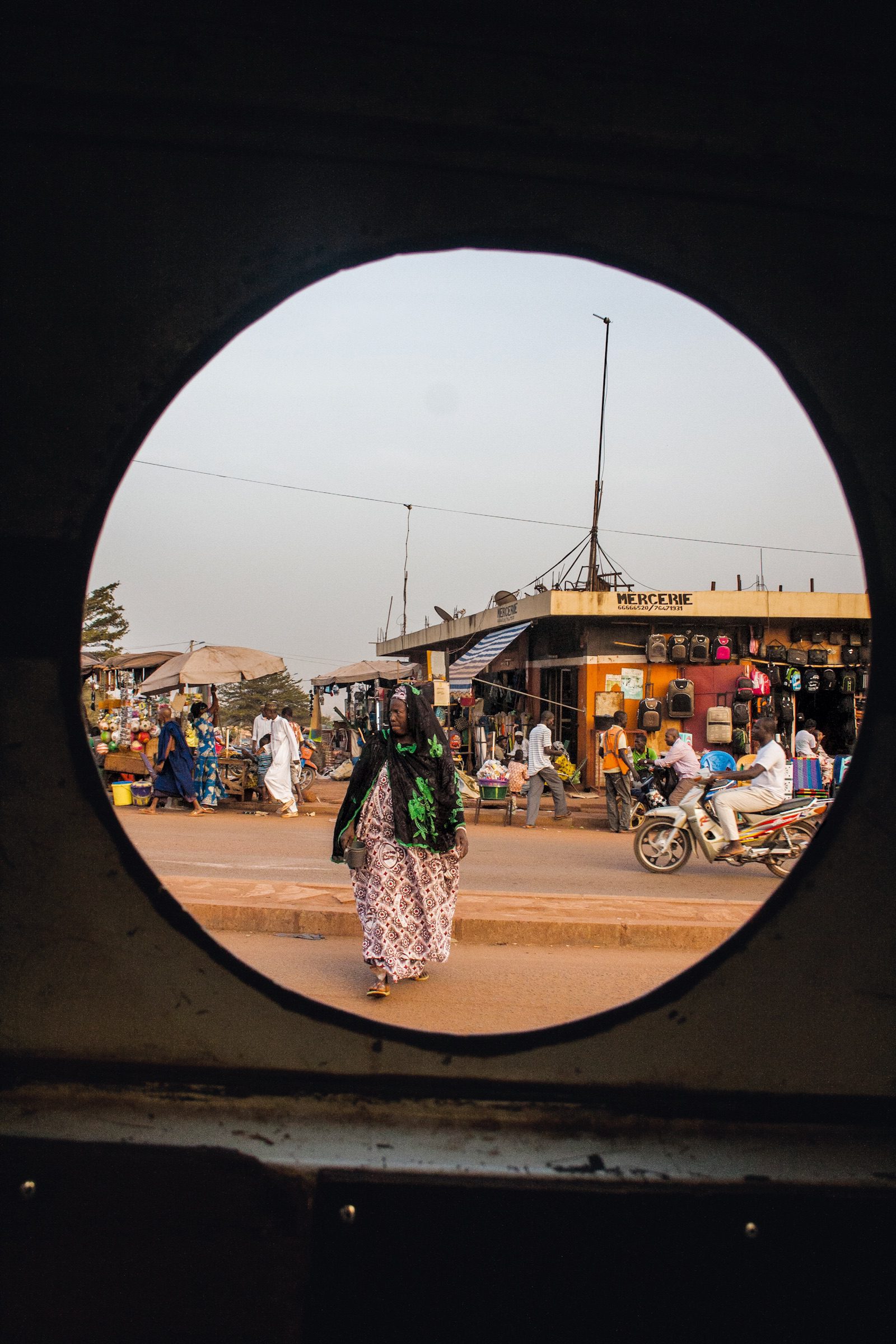 Pour la série Bamako – des fenêtres du Sotrama (2016), Amsatou Diallo a circulé dans les rues de Bamako pendant plusieurs jours en Sotramas, les minibus populaires. Ces véhicules sont les moyens de transport les plus utilisés en ville ; ils permettent à la majorité des citoyens de participer pleinement à la vie urbaine. À travers les différentes formes de fenêtres des Sotramas, Diallo a immortalisé des centaines de petites scènes de vie urbaine banale, des pourtours de Bamako au centre-ville : une femme âgée traversant la rue, une petite mosquée avec ses haut-parleurs attachés au minaret, les posters des dernières élections accrochés à un poteau. En cadrant l’espace public urbain à travers ces fenêtres, Diallo célèbre et met en valeur des scènes de la vie quotidienne. De nombreuses pratiques se répètent en de petites variations tout au long d’une journée. Ce faisant, elles donnent vie au quotidien ordinaire de la ville. Les scènes secondaires assemblées révèlent soudainement une image plus grande de la ville.