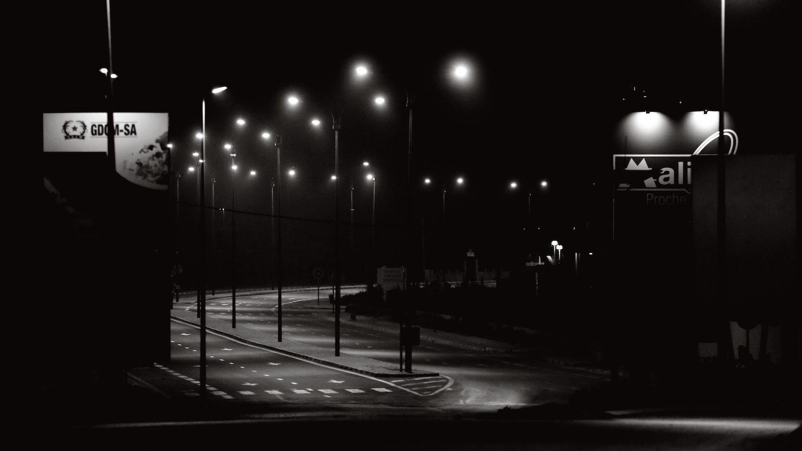 Alors que les photographies de Diallo explorent Bamako pendant la journée, Le silence de la ville (2016) de Mamadou Sekou Kone explore Bamako en moto tard dans la nuit. Ses photographies révèlent une autre facette de la ville, vue sans ses habitants, une fois que les citoyens se sont retirés dans leurs sphères privées et que l’espace public se présente calme, morne et vide. L’éclairage électrique réduit la vue, mettant en avant des éléments de l’espace urbain plus statiques : rues, ponts et autres signes de signalisation émergent nettement sous les réverbères ; les enseignes lumineuses, les arbres immenses et les monuments apparaissent indistinctement dans l’obscurité. Les photographies en noir et blanc rappellent des photos de film. Leur intemporalité apparente confère une dignité à la ville et, dans cette ambiance onirique de la nuit, les frontières et les silhouettes se fondent, rendant tout repère dans l’espace inidentifiable.