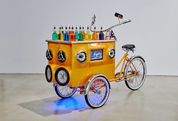 Puerto Rican artist Miguel Luciano appropriates elements from popular culture such as Schwinn bicycles to commemorate the traditions of the Puerto Rican clubs in New York. In Pimp my Piragua, Luciano celebrates the innovations of Latino street vendors by transforming a standard crushed ice cart into a hyper-modified tricycle with a built-in hi-fi sound and video recording system. After immigrating to the United States from Cuba in 2011, the artist Yali Romagoza focused her work on the exploration of identity, power and feminism in an intercultural space. In the installation Monument To The Great Living Artist (2018) Romagoza plays Cuquita, “the Cuban doll”, while she dances “Se acabó” (“It’s over”) by La Lupe and recites the essay “Why Have There Been No Great Women Artists?”. At the end of her performance, Cuquita leaves the following message: “American Feminism as it stands is a white middle-class movement” (Ana Mendieta) and “The Choice is yours. Say it but with an accent” (Cuquita, the Cuban Doll).