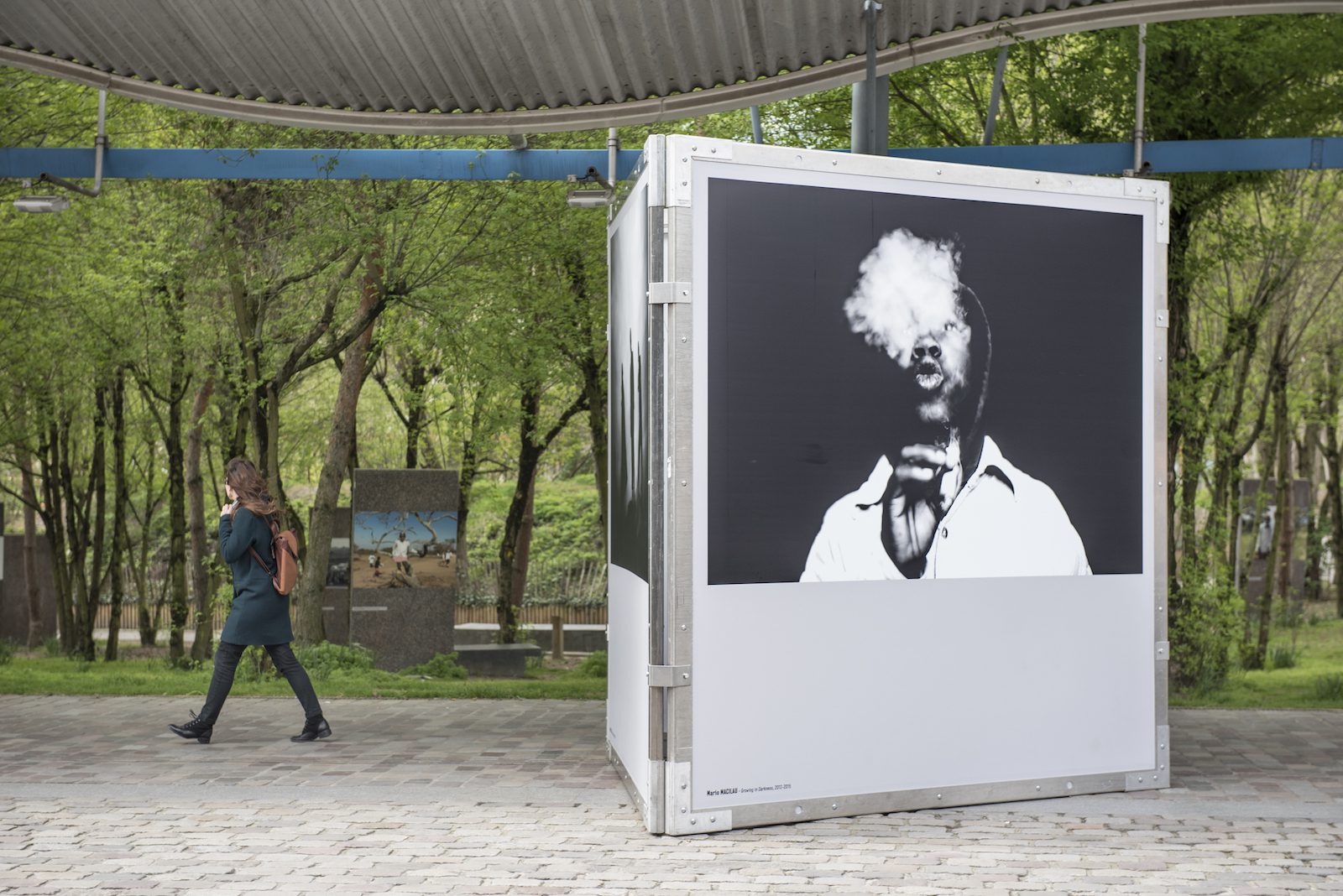 Vue du parvis de la Grande halle de La Villette, dans le cadre du Mois de la Photo du Grand Paris et de l’exposition « Afriques Capitales », une photographie d’Alexis Peskine, Le Radeau de la Méduse, , 2016. Photo © Elsa Guily
