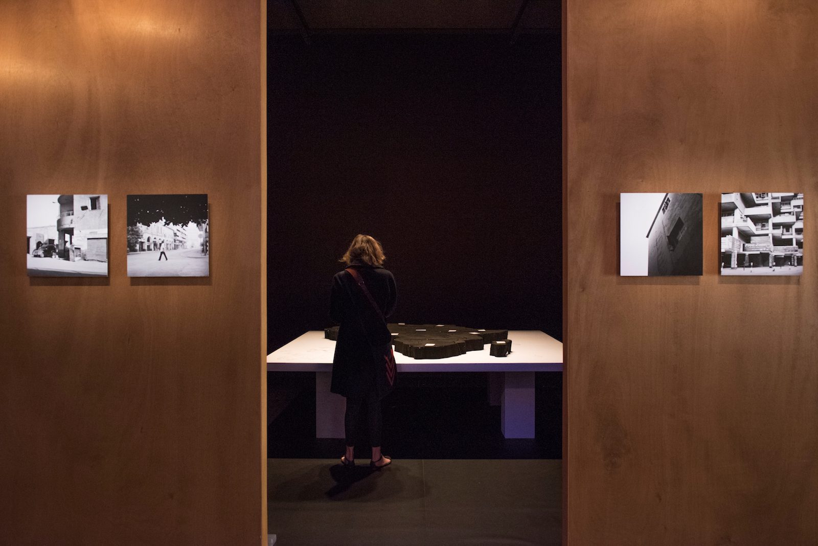 Plongé.e dans l’obscurité, on pénètre dans l’espace d’exposition qui s’est enfin affranchi de ses murs blancs. Du moins tout ce qu’il en reste est matérialisé dans Labyrinth de Youssef Limoud, métaphore d’une ville en ruine. Cette sculpture monumentale située au carrefour de l’exposition traduit l’intention curatoriale de Simon Njami de présenter une pensée labyrinthique de la ville. L’œuvre de Limoud nous interpelle à la fois sur un plan mental et physique. C’est une invitation à la perte de soi et au dépassement pour trouver une issue de secours. L’équilibre du corps et la stabilité du regard de celui qui tente de s’y aventurer sont mises à mal. Ce labyrinthe nous permet d’ores et déjà de décentrer notre perception et de comprendre qu’il va falloir renoncer à une cartographie signalisée de l’exposition collective. Fini le déambulemente habituel des connaisseurs de l’art, on est dans un tas de ruines, un lieu informel qui n’attend d’être signifié que par la lecture sensorielle de chacun.une. Ces pans de murs pourraient nous tomber dessus comme pour faire état des lieux des vies précaires sujettes au cycle de violences post-11-Septembre. Cette agora dévastée nous interroge sur les conditions de préservation d’une sphère publique où le déploiement de la pensée critique resterait possible (2). Quel est le dessein social de ces machines infernales que sont les métropoles, pompes névralgiques du capitalisme à outrance ?