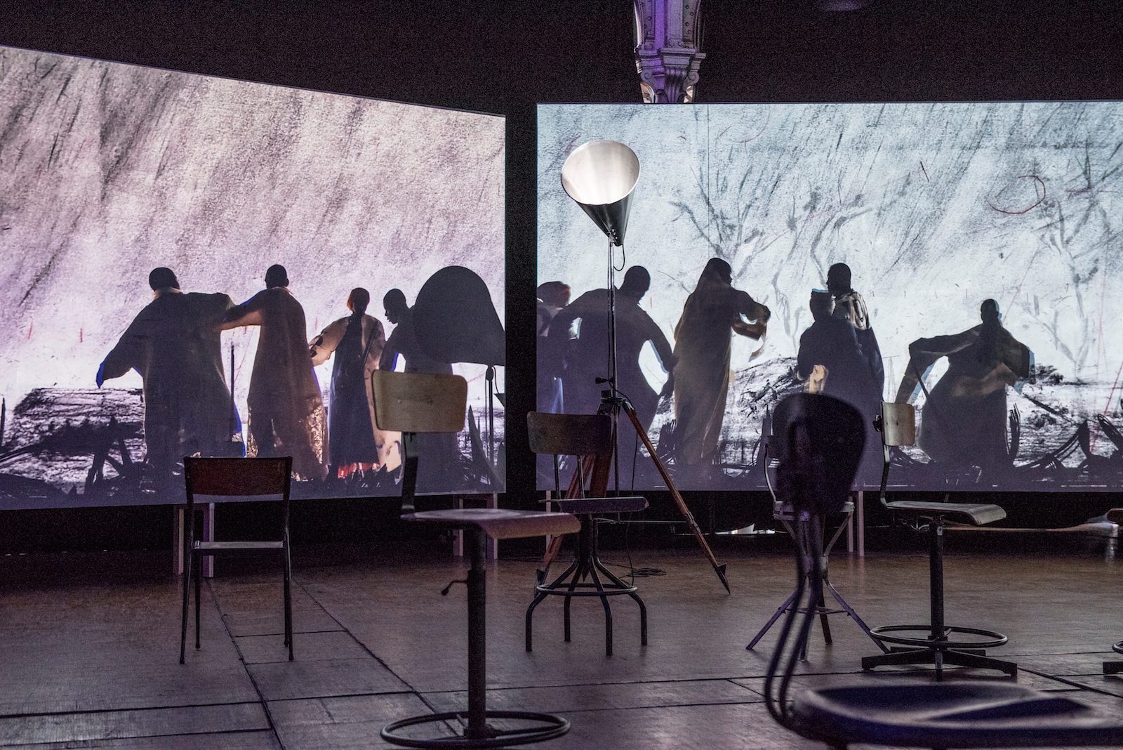 Vue de l’installation de William Kentridge, More Sweetly Play the Dance, installation vidéo 15’, 2015. Exposition « Afriques Capitales », photo © Nicolas Krief
