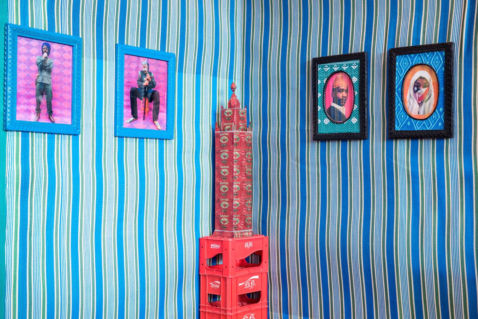 À l’entrée de la halle, Le Salon, une installation de Hassan Hajjaj, accueille le public. Cet entre-deux convivial permet de faire le lien entre l’espace public extérieur et l’intérieur de l’exposition. L’artiste nous invite à l’interaction sociale en créant cet environnement jovial et chaleureux, réalisé à partir d’objets manufacturés détournés et de ses photographies.