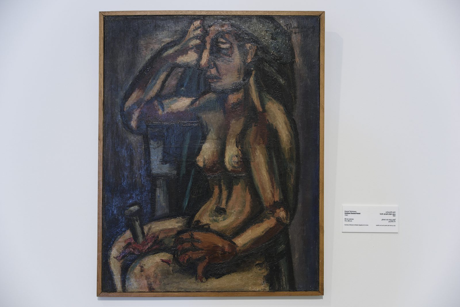Kamel Telmisany, Untitled (Seated Nude), 1941. Oil on canvas, 73 x 58 cm. Installation view. When Art Becomes Liberty: The Egyptian Surrealists, Palace of Arts, Cairo. Courtesy of Museum of Modern Egyptian Art in Cairo. Image courtesy of Sharjah Art Foundation.