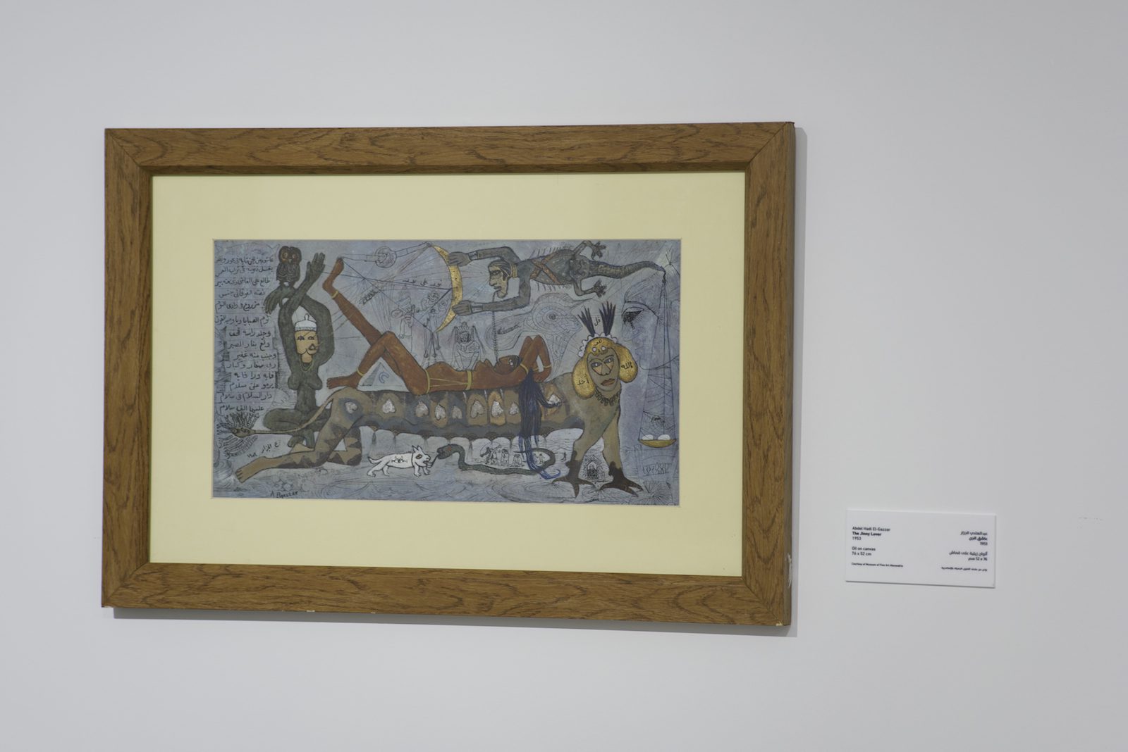 Abdel Hadi El-Gazzar, The Jinny Lover, 1953. Oil on canvas, 76 x 52 cm. Installation view. When Art Becomes Liberty: The Egyptian Surrealists, Palace of Arts, Cairo. Courtesy of Museum of Fine Art Alexandria. Image courtesy of Sharjah Art Foundation