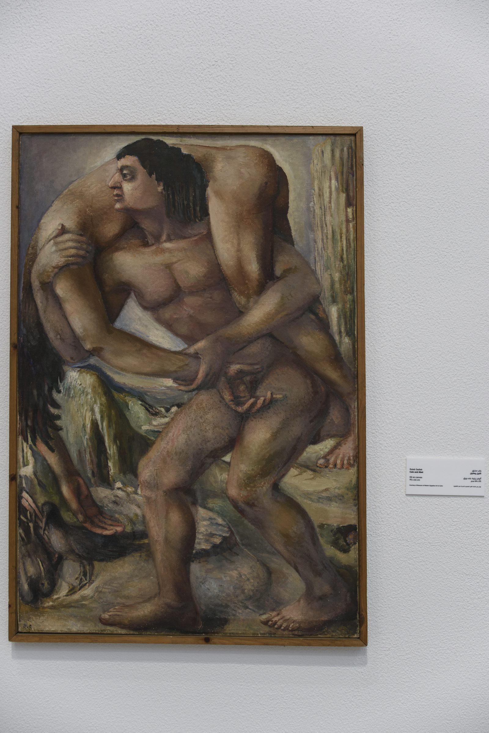 Rateb Sediek, Cain and Abel. Oil on canvas, 95 x 64 cm. Installation view. When Art Becomes Liberty: The Egyptian Surrealists, Palace of Arts, Cairo. Courtesy of Museum of Modern Egyptian Art in Cairo. Image courtesy of Sharjah Art Foundation