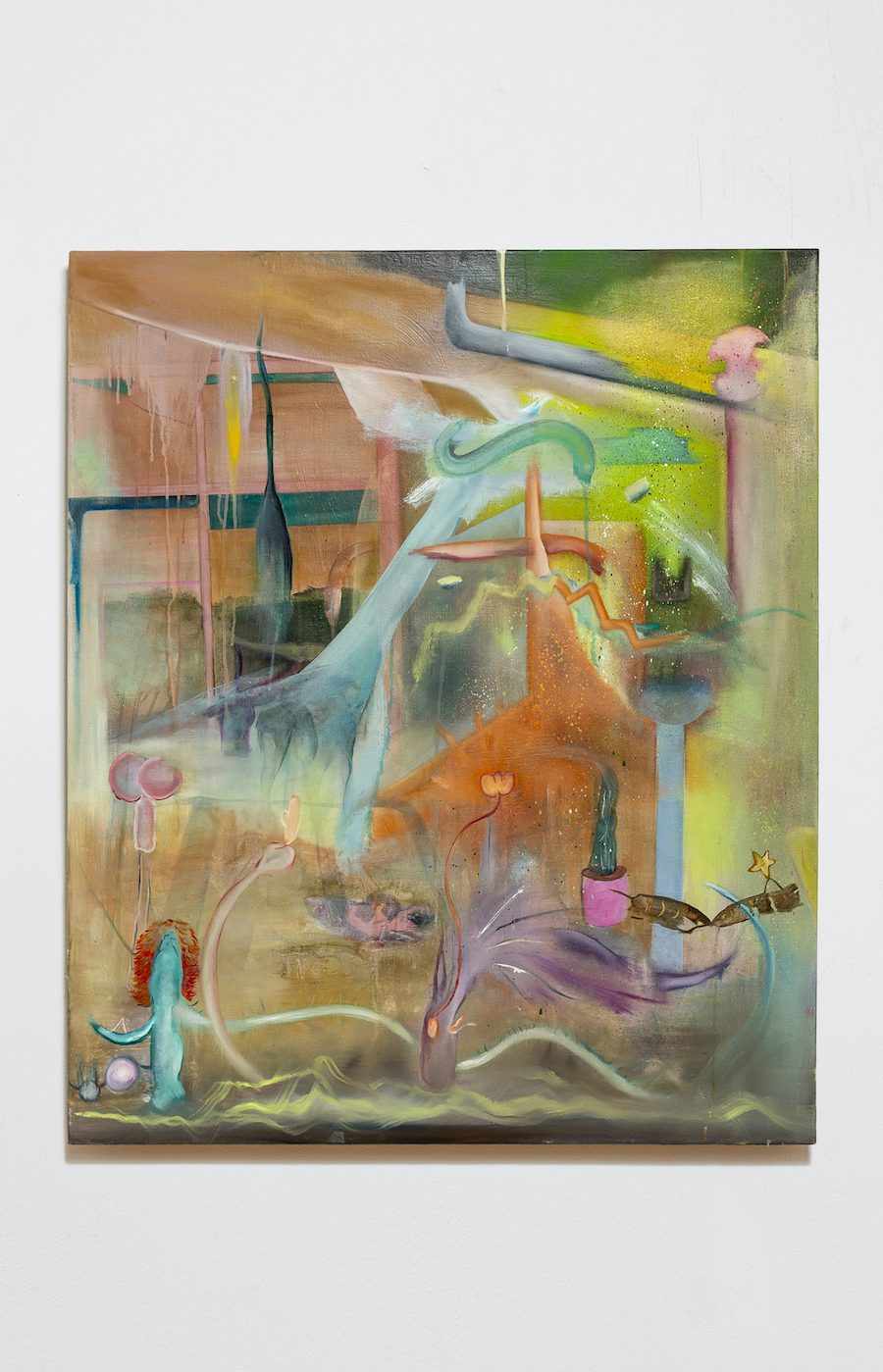 Fluctuations of emotions triggered by various experiences build up to a narrative that eludes interpretation. The core of her work is this process that seeks to narrate an experience through expressionist brushwork and surrealist methodology. A central aspect in those narratives is the concept of eruption, appearing as distorted forms, body parts, colours or layers, all bathed in a fluidity that is punctuated with striking detail.