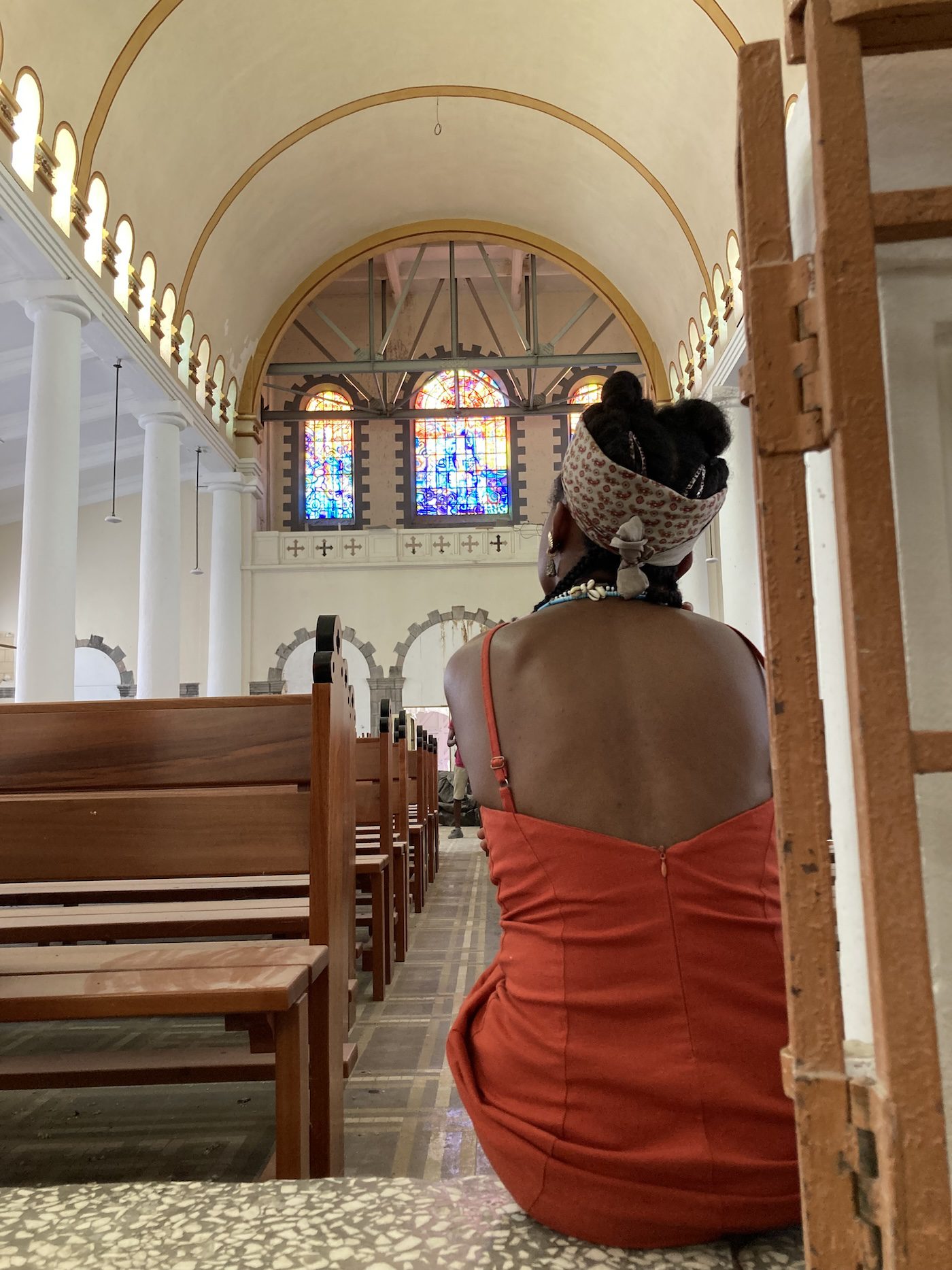 L’artiste et collaboratrice de longue date Anna Pi assise devant les vitraux de Victor Anicet à la cathédrale de Saint-Pierre, en Martinique. Photo: Marny Garcia Mommertz.