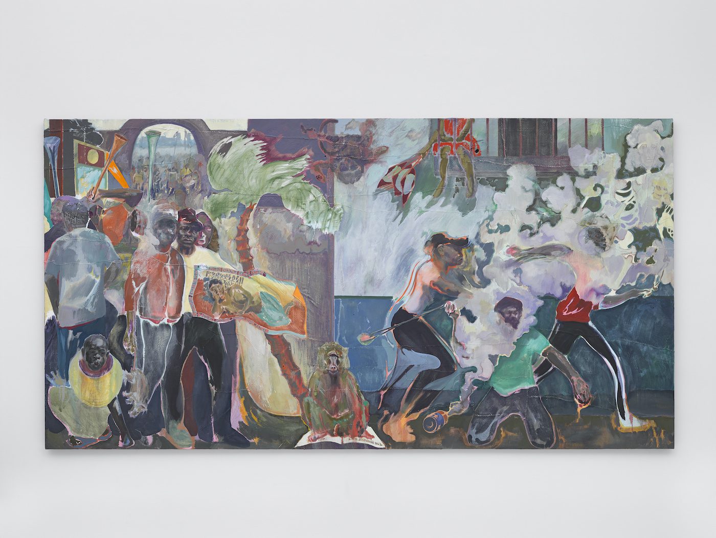 Accomplice brings together a series of eight paintings and nine preparatory ink drawings by Kenyan artist Michael Armitage created over a two year period beginning in 2017. Presented for the first time as a complete cycle, the catalyst for these works were events connected to the 2017 Kenyan General Elections. At the time, Armitage travelled to Uhuru Park, in Nairobi, to witness a major rally that was being staged by the country’s main opposition party. The observations made at this rally, in addition to images culled from social and broadcast media, are the basis for paintings that engage the Kenyan body politic. These perceptions, filtered through the artist’s oneiric vision, open up multiple narrative and conceptual possibilities.
