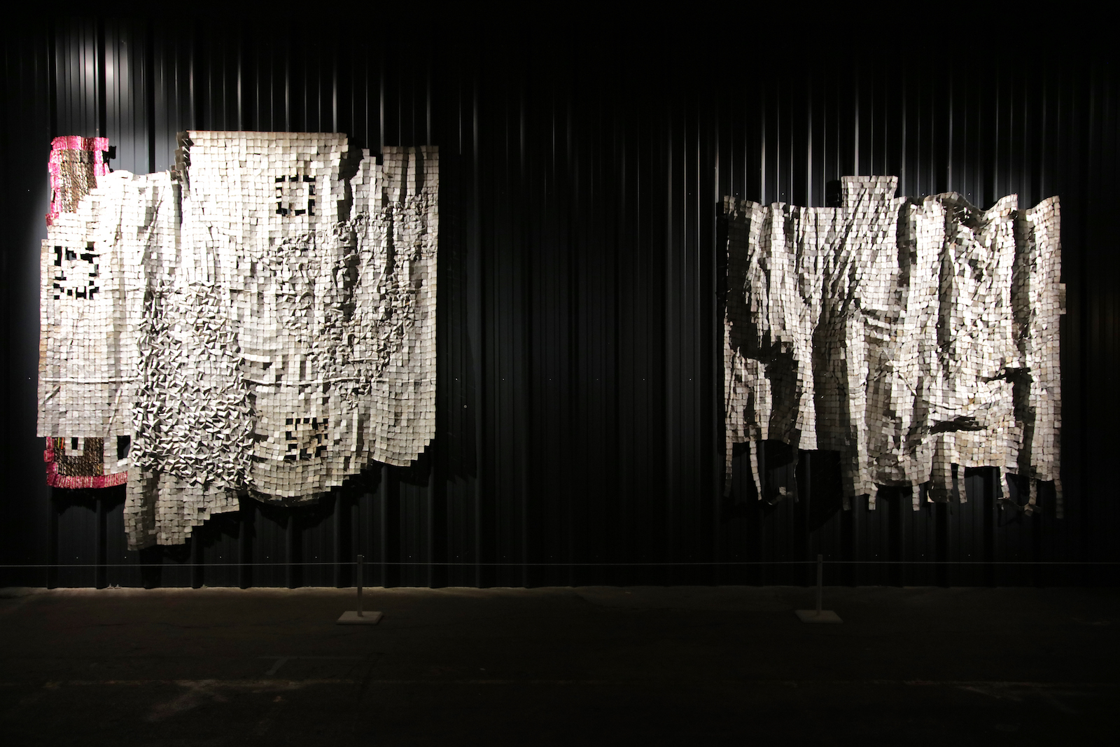 Left – El Anatsui – Delta, 2014 – Right – El Anatsui – Metas II, 2014 – ©Maxime Dufour Photographies – Exposition Afriques Capitales, dans le cadre du printemps 2017 à Saint Sauveur