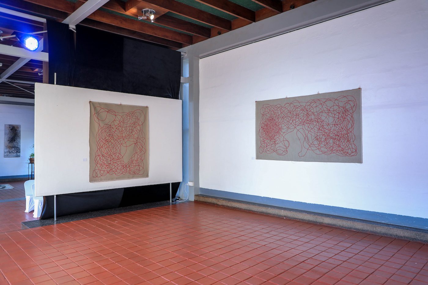 In Shadi’s work I was moved by a repetitive gesture that from afar looked like red thread sown onto the linen, and more closely is text written and overwritten, illegible to me, and yet the shapes of the letters familiar. I initially I thought to myself, if I try hard enough maybe I can read to understand, but I soon understood that that isn’t what the work was asking of me. Text inscribed and legibility denied. And so I find another way in, I imagine the process, the movement of the red pen over the sand-coloured linen, in smooth overlapping curves, over and over and over, and a calmness arrives.