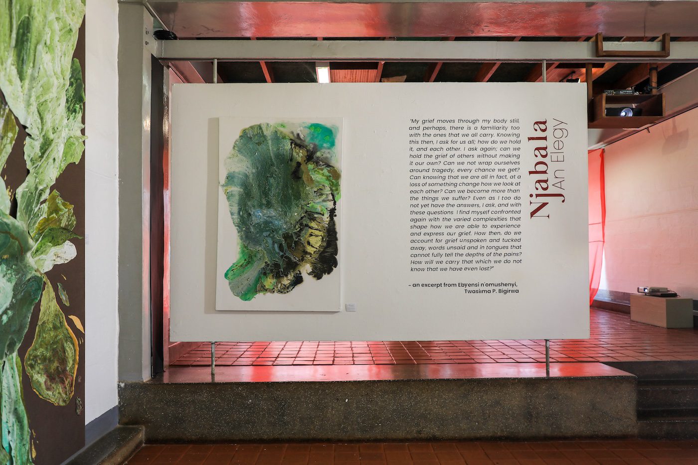 Installation view of Njabala: An Elegy at Njabala Foundation. Works on canvas by Letaru Dralega, text by Twasiima Bigirwa. Photo: Royal Kenogo.