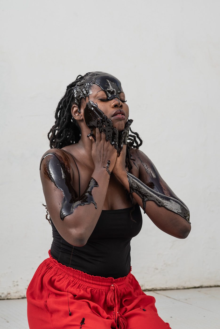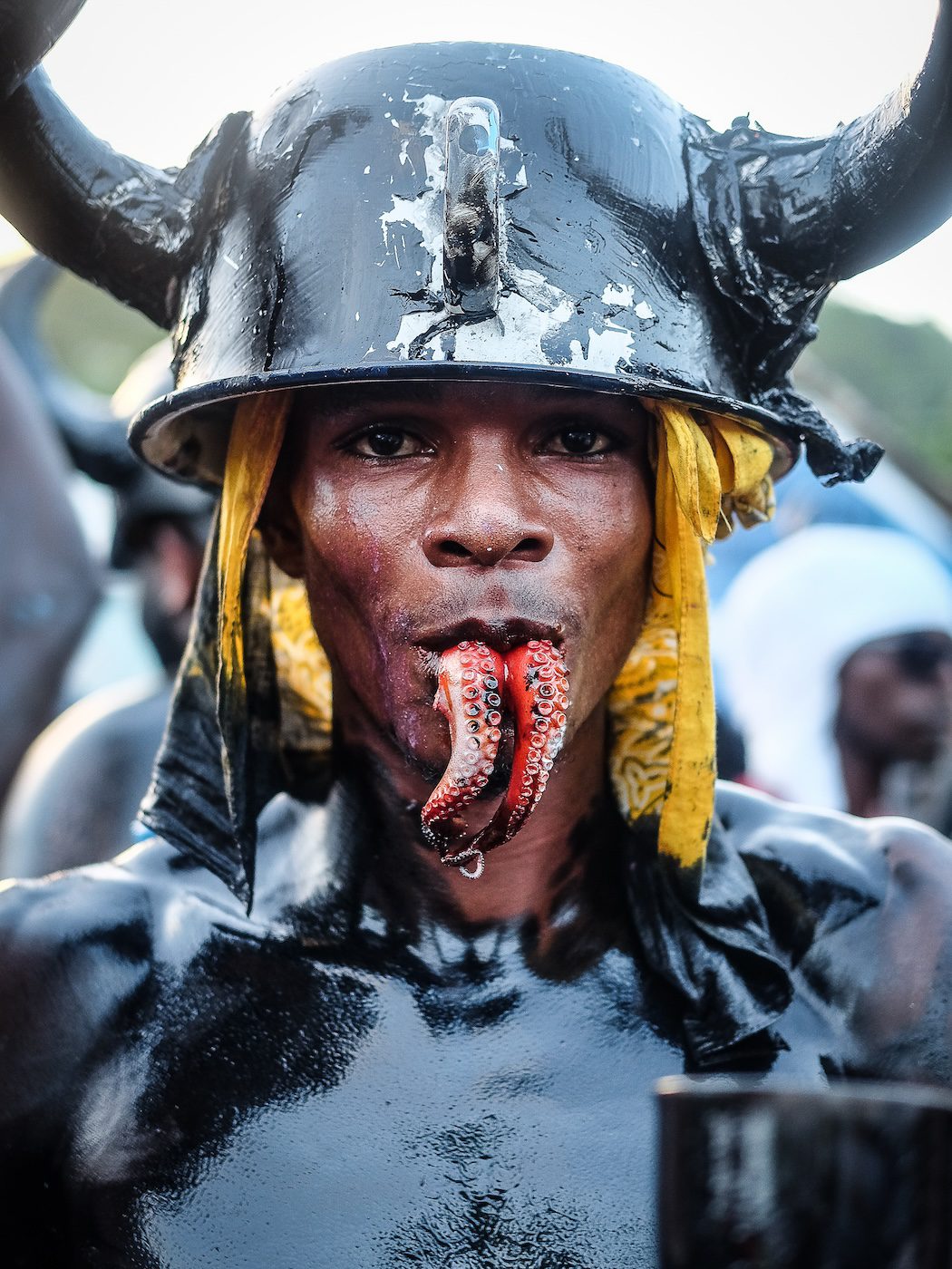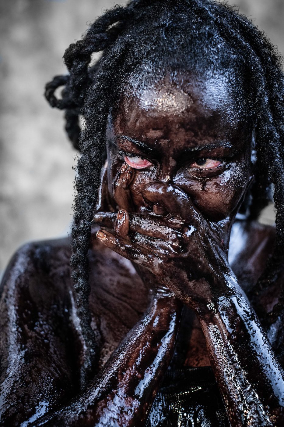 Cheleux has a degree in photography but her practice began long before that, being inherently linked to carnival and her own identity. Besides participating in carnival activities, she began making images of different carnivals in the Caribbean and became fascinated with the use of sugar-cane molasses, gwo siwo in Guadeloupean Creole, as a costume element on people’s skins. “My Guadeloupean identity goes through carnival. That is how I see it and how I live it. Visually, it [carnival] is the gwo siwo for me.” In carnival the syrup, a byproduct of rum production, stands symbolically for maroons,the liberation of enslaved people and the pride in being Afrodescendant.